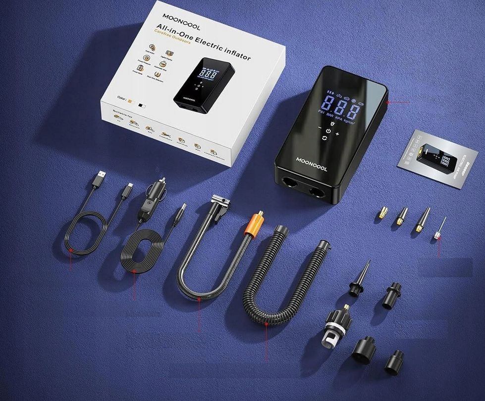 Zestaw zawiera i wskazówka: 1 x elektryczna pompka powietrza MOONCOOL 1 x nadmuchiwany wąż, 1 x wąż o dużej pojemności, 4 x dysza powietrza (rower, boja, kula itd.), 5 dysz o dużej pojemności, 1 x kabel USB do ładowania, 1 x samochodowy przewód zasilający, 1 x instrukcja obsługi (może nie być dostępna w języku polskim). ) ) . . Pompy do opon do wielokrotnego ładowania są ściśle kontrolowane i testowane od projektu do produkcji. Jeśli masz jakiekolwiek pytania, daj nam znać, a my pomożemy Ci w ciągu 24 godzin