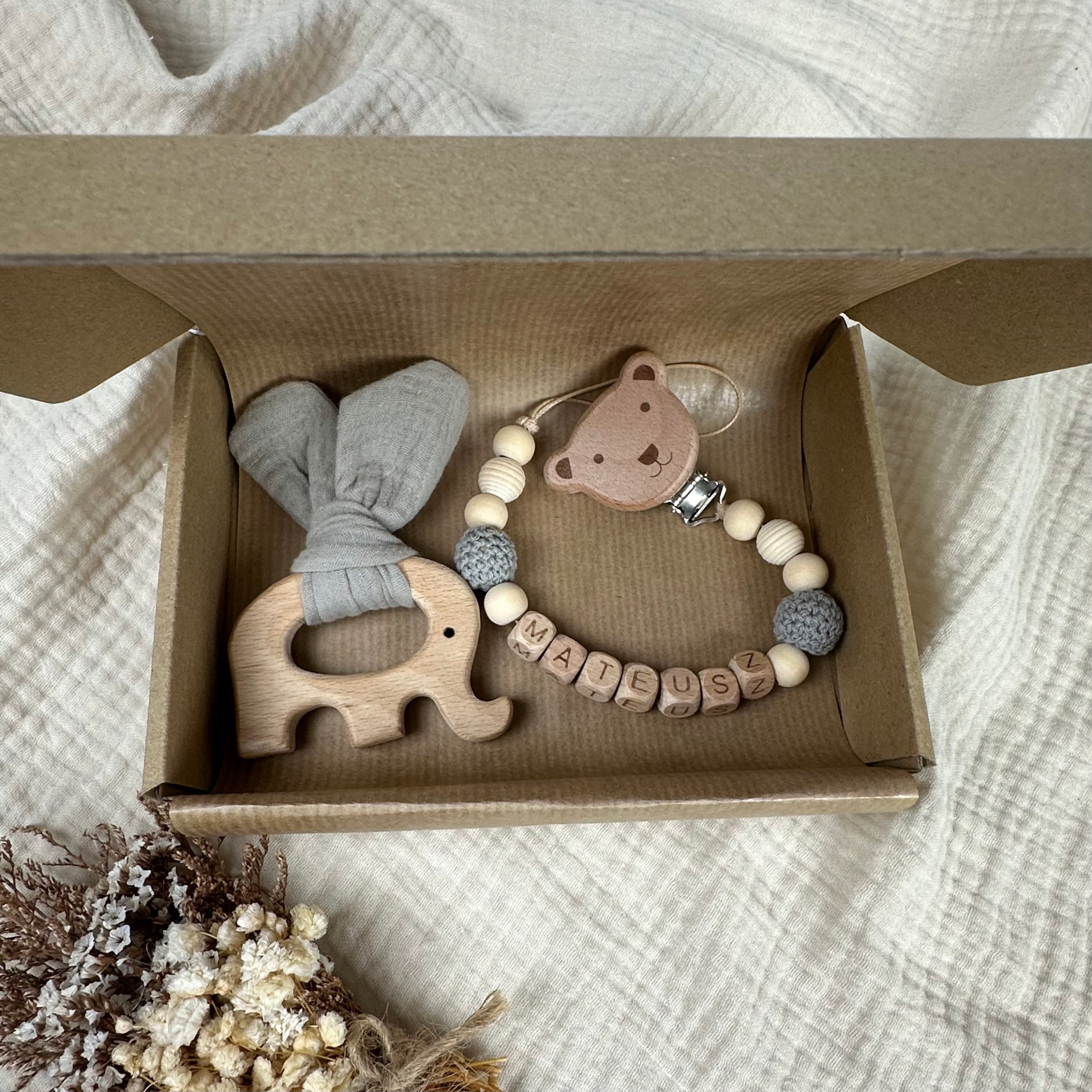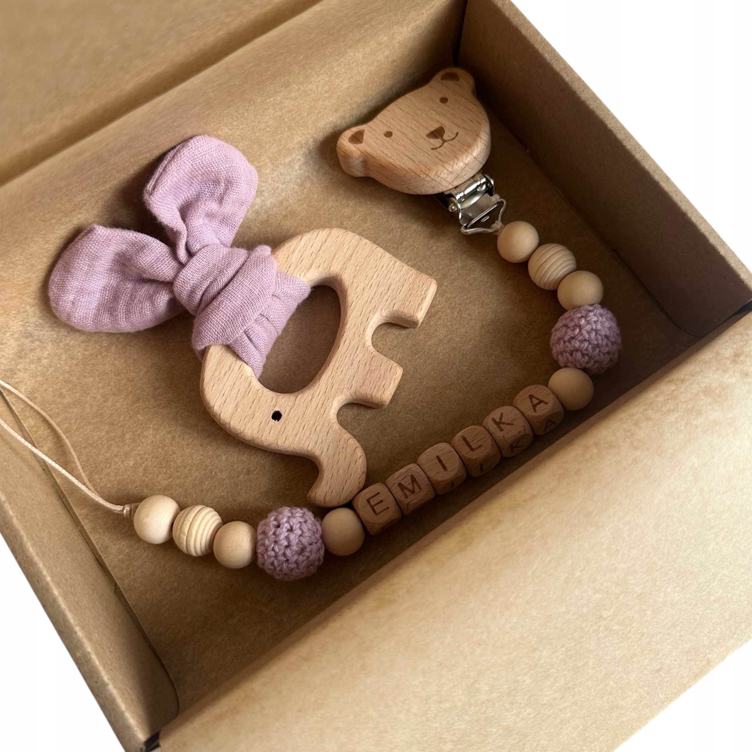 Drewniana zawieszka do smoczka + gryzak z uszkami – zestaw handmade