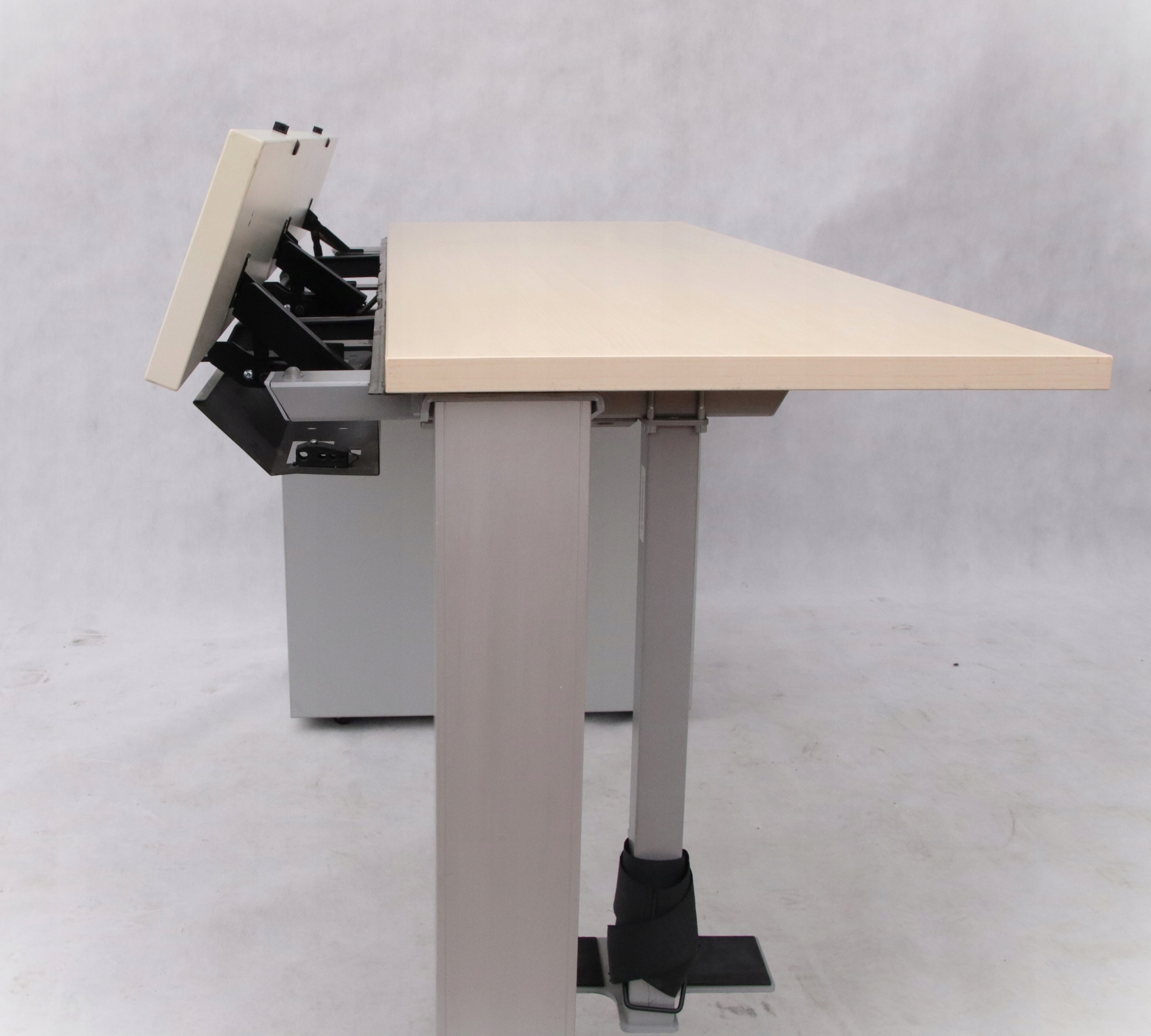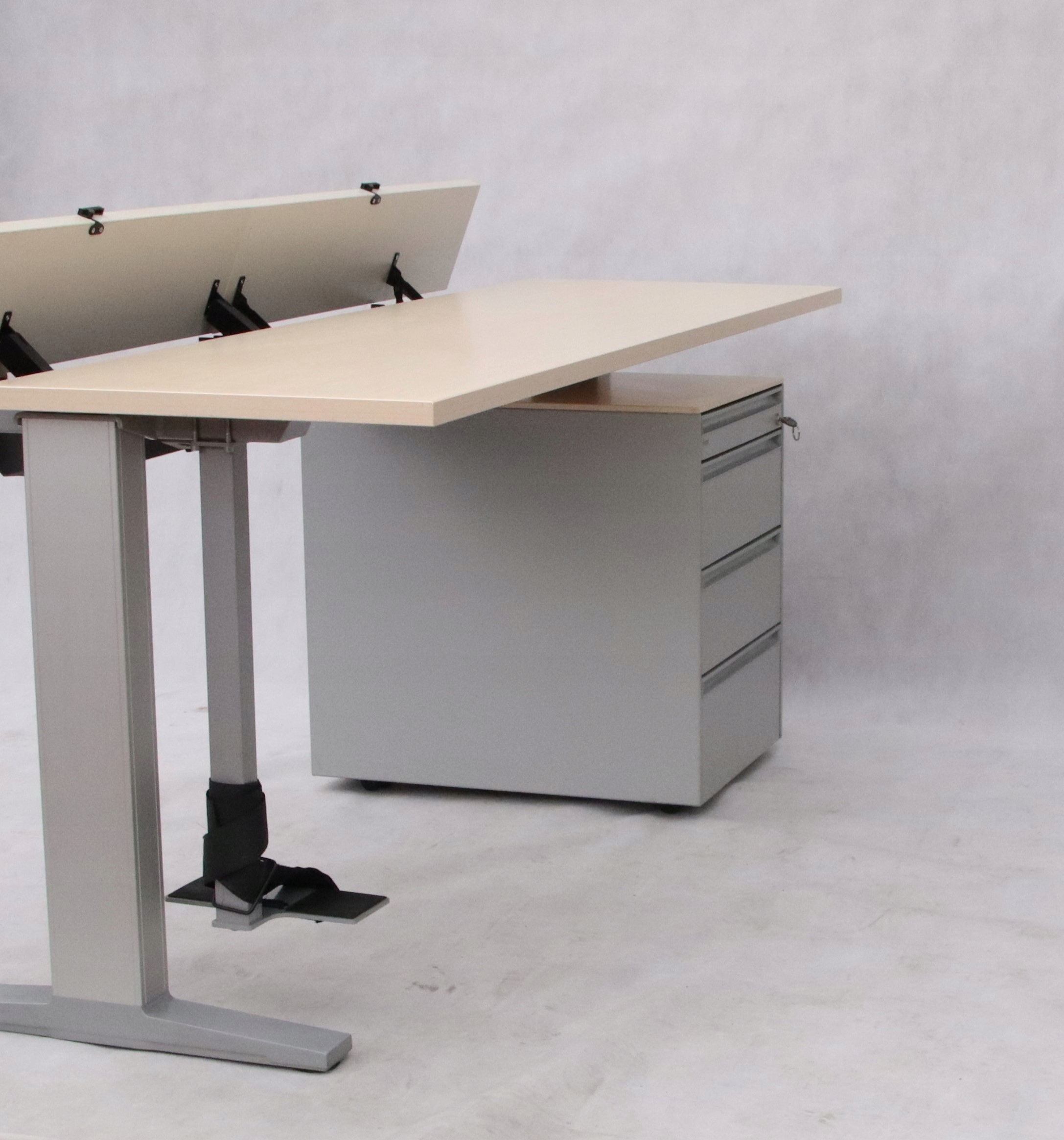 Biurko firmy Bene to połączenie prostego designu i wysokiej jakości materiałów. Biurko składa się z trzech elementów dużego blatu i dwóch klapek do wygodnego ułożenia przewodów w maskownicy znajdującej się pod blatem. Zastosowane rozwiązanie umożliwia wygodne ułożenie przewodów. Pod blatem metalowy stelaż do którego przymocowane są dwie nogi i uchwyt pod komputer.