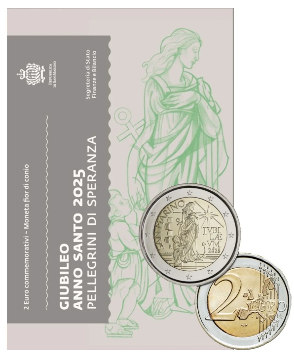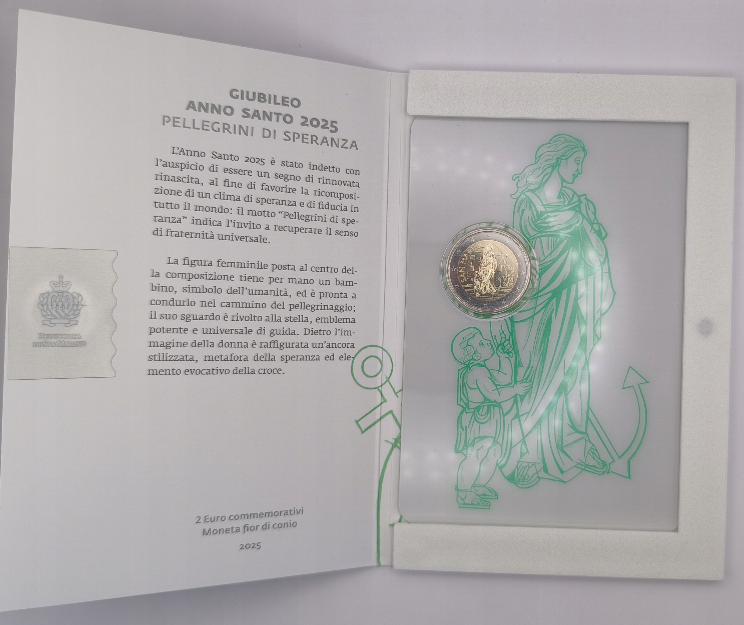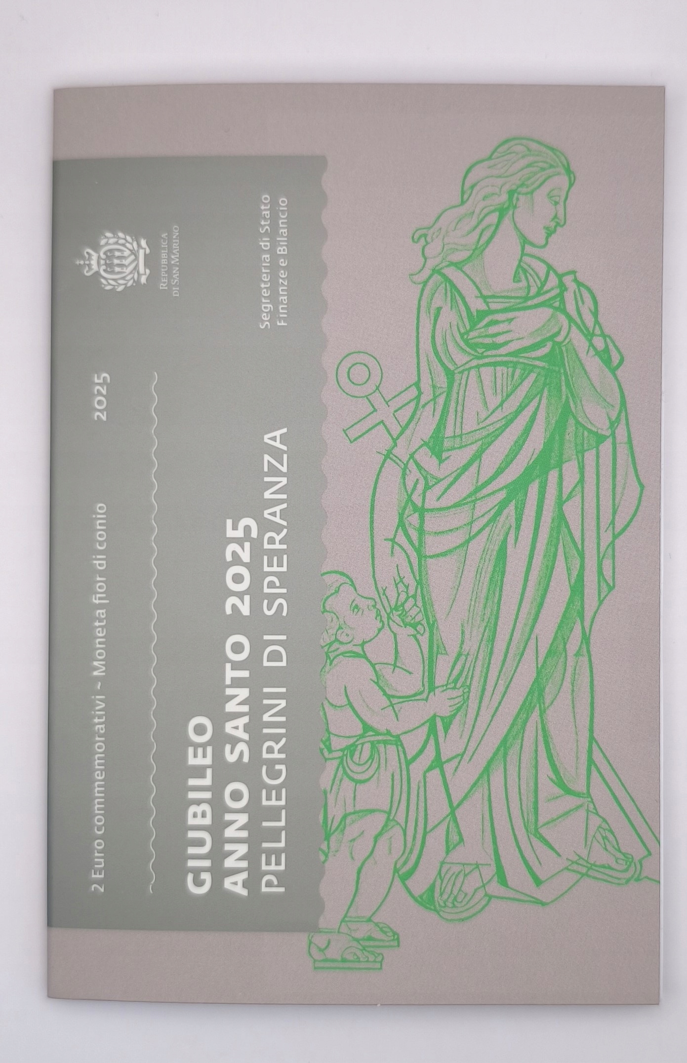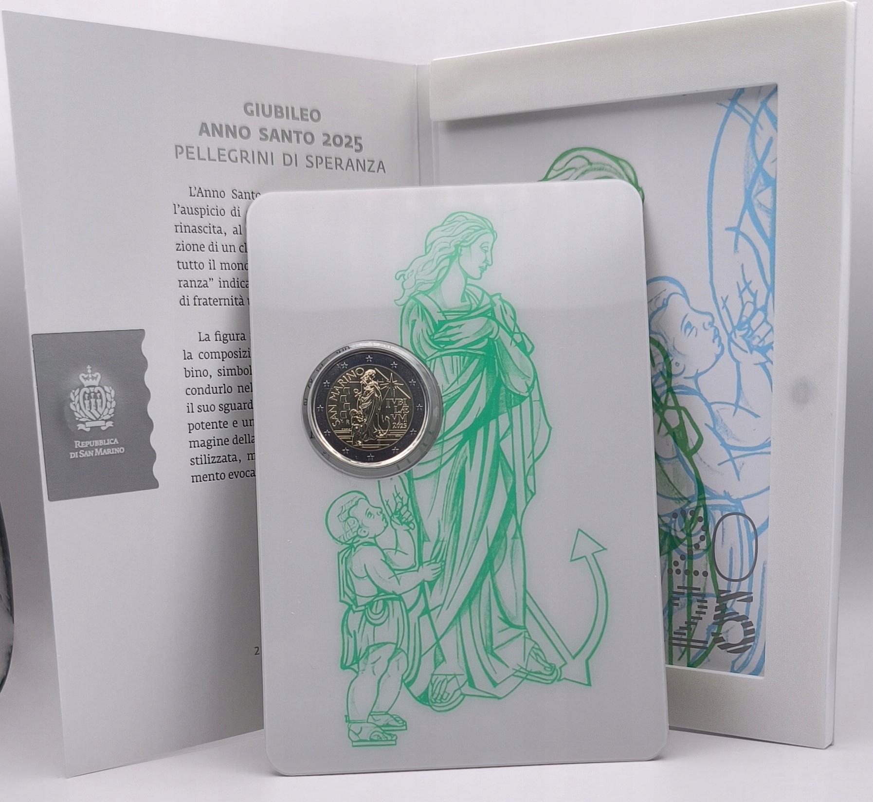 Pierwsza moneta okolicznościowa 2 euro w oryginalnym folderze  wyemitowana przez San Marino w roku 2025, nosi tytuł "Jubileuszowy Rok Święty 2025 - Pielgrzymi nadziei".