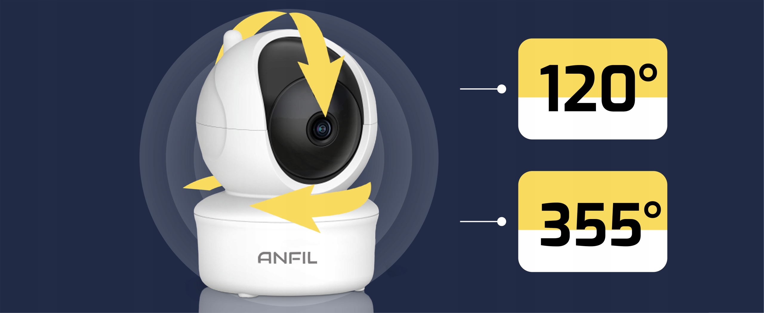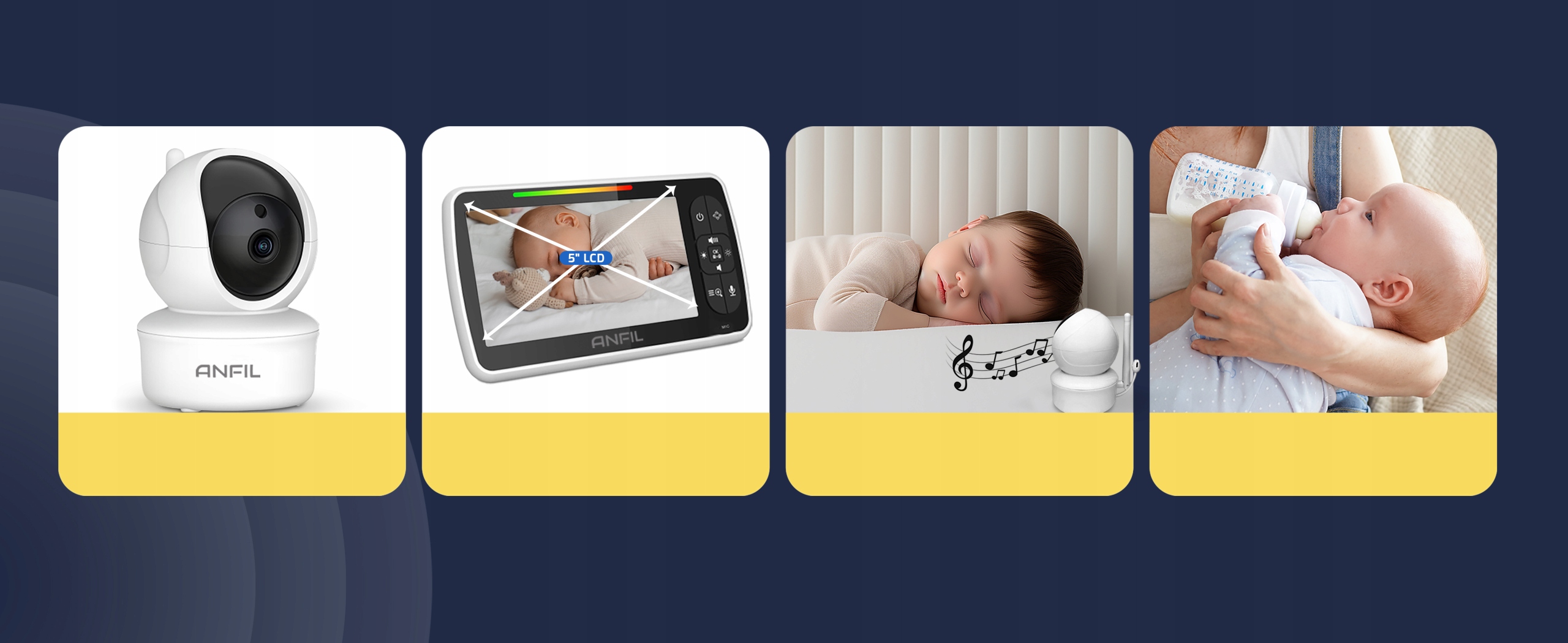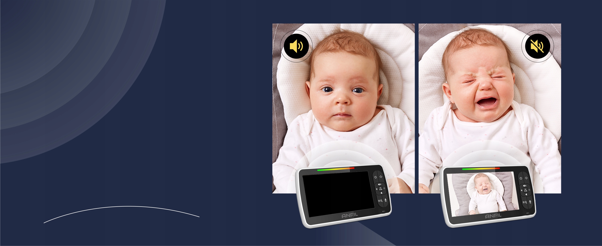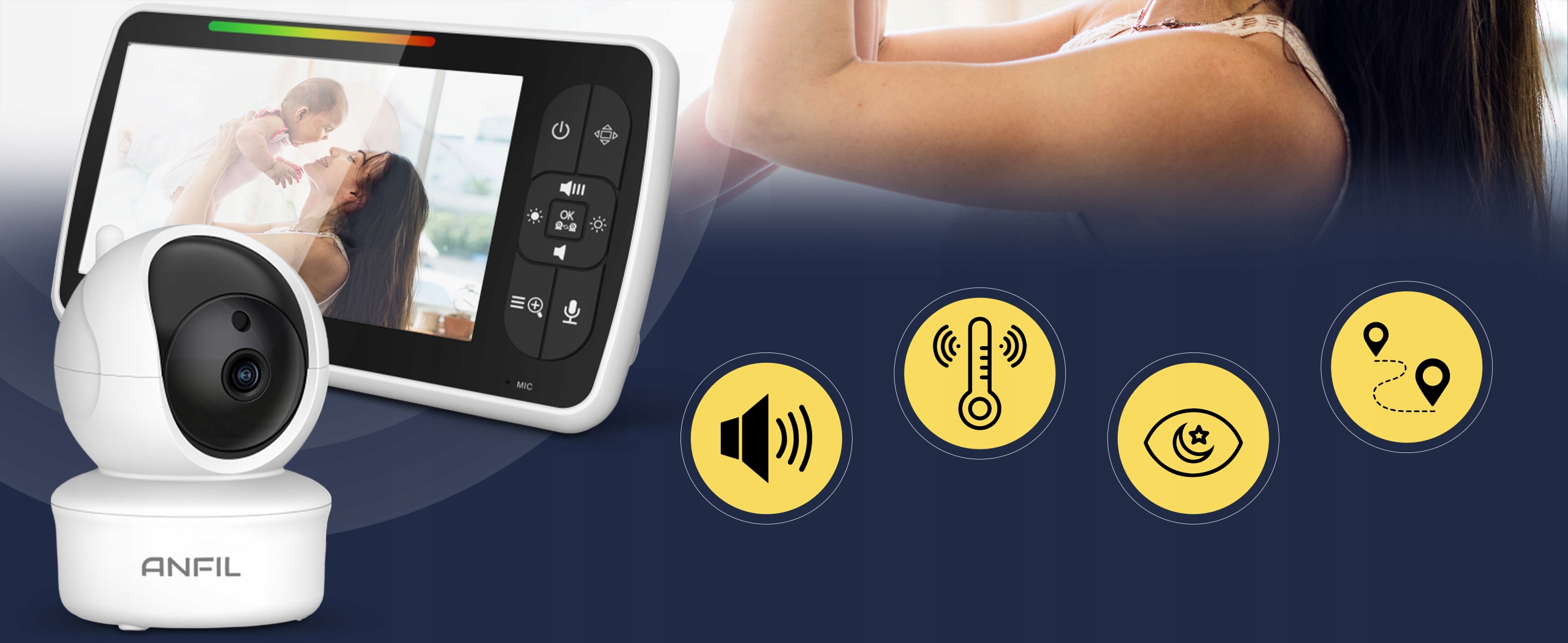 Elektroniczna niania ANFIL zapewnia wyraźny 5-calowy ekran HD i pełne pokrycie pomieszczenia dzięki obrotowi w poziomie 355° i pionie 120°. Dzięki trybowi VOX ciesz się nawet 12 godzinami ciągłego monitorowania.