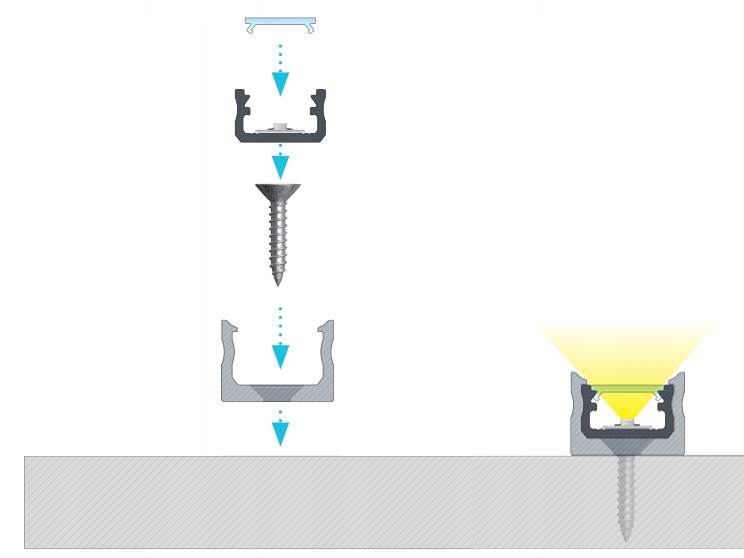 Montaż powinien być wykonany starannie i przemyślanie dlatego że wkręcenie wkrętów montażowy trwale uszkadza powierzchnię do której mocujemy listwę oświetleniową (powstają otwory od wkręcanych śrub)