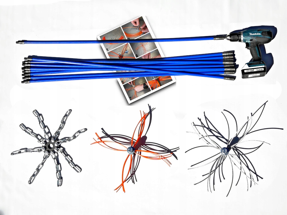 ZESTAW SZCZOTKA DO MECHANICZNEGO CZYSZCZENIA KOMINA OD DOŁU - DŁUGOŚĆ 7M + 3 GŁOWICE. ZESTAW DO KOMINA CYKLON.