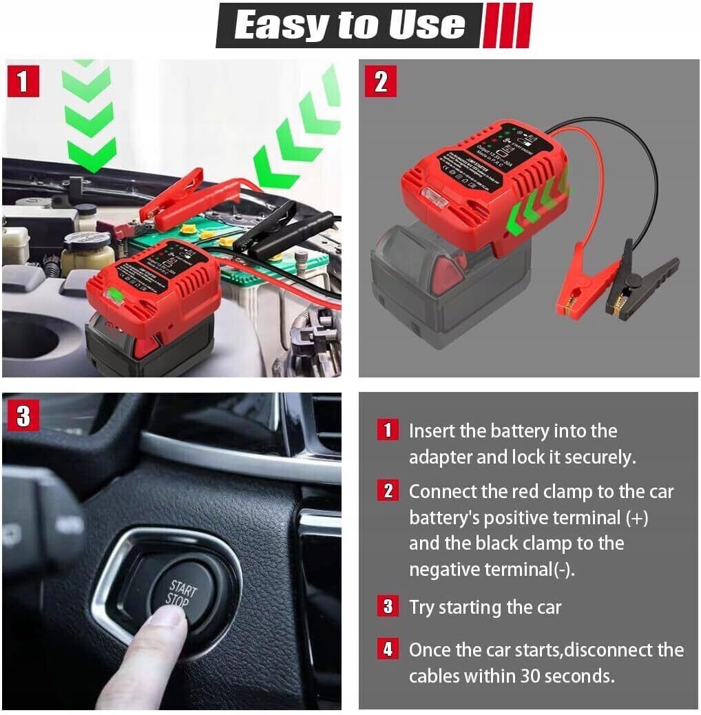 【Nowo ulepszony kabel rozruchowy Jump Starter】jump został zaprojektowany tak, aby był kompatybilny tylko z akumulatorem Milwaukee(Kompatybilny z akumulatorami Milwaukee). Łatwy w użyciu, wystarczy tylko przesunąć zasilacz do rowka, a następnie popchnąć konwerter i upewnić się, że zablokował baterię. (Bateria nie jest dołączona).