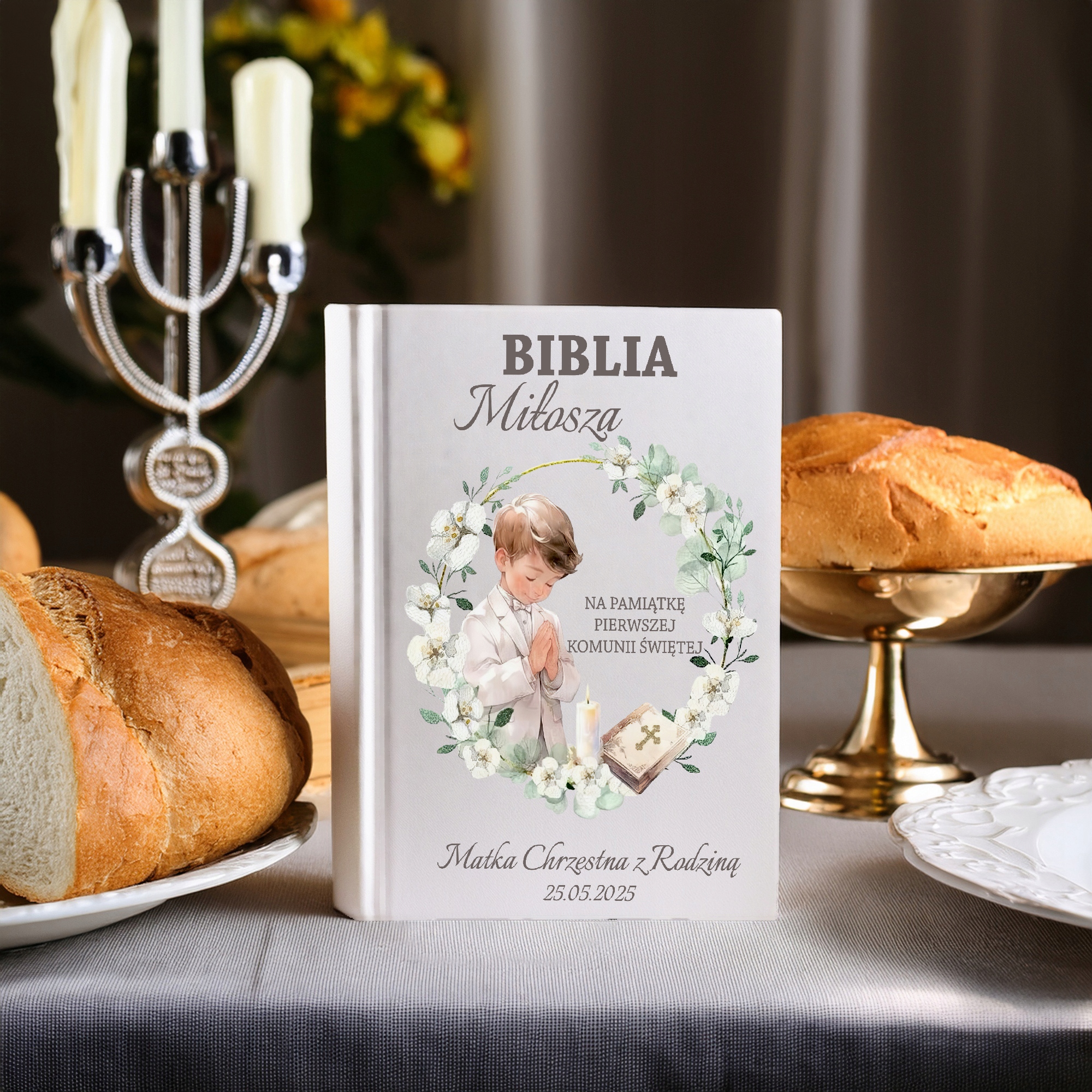 ➡️ Jeżeli szukasz pięknego i praktycznego prezentu na Pierwszą Komunię Świętą, wybierz personalizowaną Biblie w białym pudełku z nadrukiem.