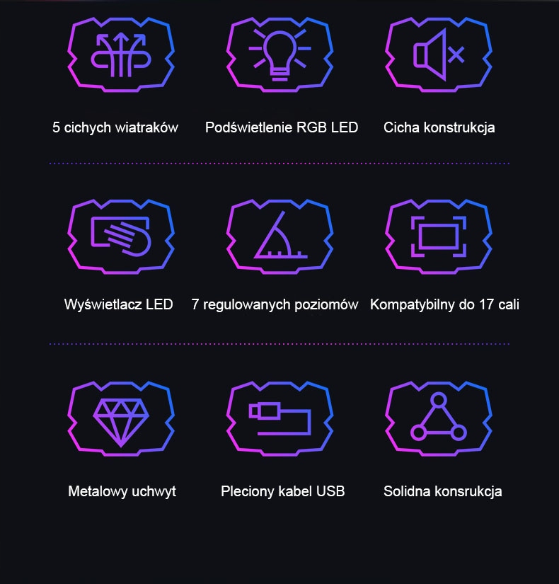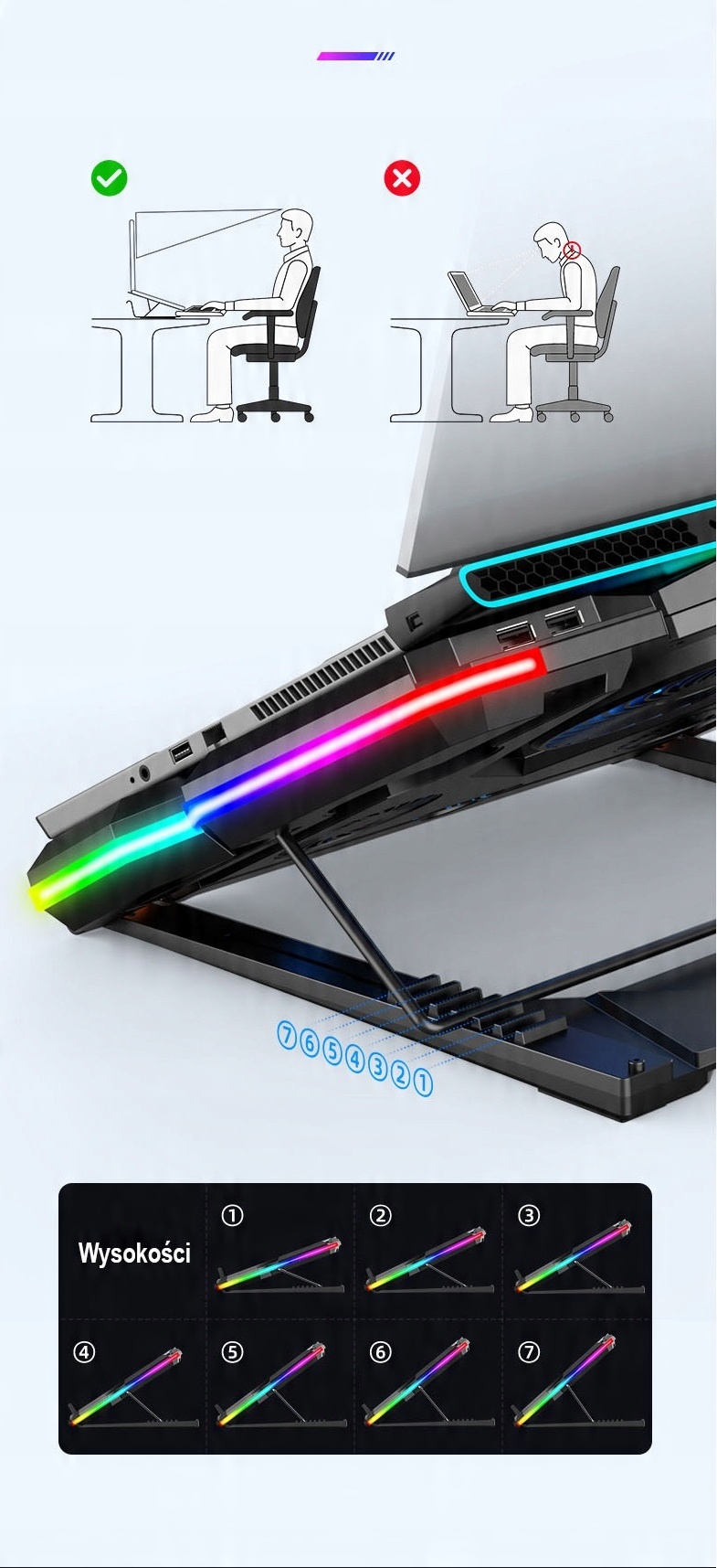 Подставка для ноутбука - это, прежде всего, современный дизайн, стабильная конструкция и эффективный система вентиляторов с возможностью регулировки оборотов. Расположение вентиляторов обеспечивает отличное и эффективное охлаждение ноутбука независимо от расположения нагревающихся компонентов ноутбук (процессор, видеокарта,микросхемы питания, жесткие диски). Широкая совместимость с ноутбуками и ноутбуками с различными размерами матриц 10,12,13,14,15.6, 16, 17". Конструкция позволяет использовать подставку на коленях. очень тихо. неслышимый. Нижняя часть основания имеет дополнительные ножки для увеличения угла наклона, так что обеспечить максимально эргономичную работу.