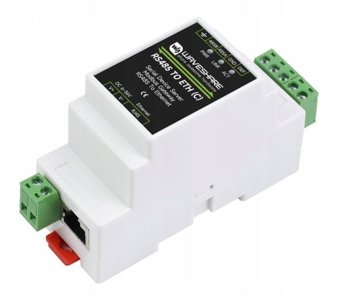 to przemysłowy media konwerter RS485 na Ethernet w obudowie do montażu na szynie DIN. Łączy wiele funkcji w jednym, w tym serwer szeregowy, bramkę Modbus, bramkę MQTT, RS485 do JSON itp. Urządzenie zapewnia przeźroczystą transmisję danych. Obsługuje protokół Gateway Modbus RTU / Modbus TCP. Moduł można zasilać napięciem stałym z zakresu 6-36V. Konwerter posiada izolację linii zasilania oraz linii danych RS485.