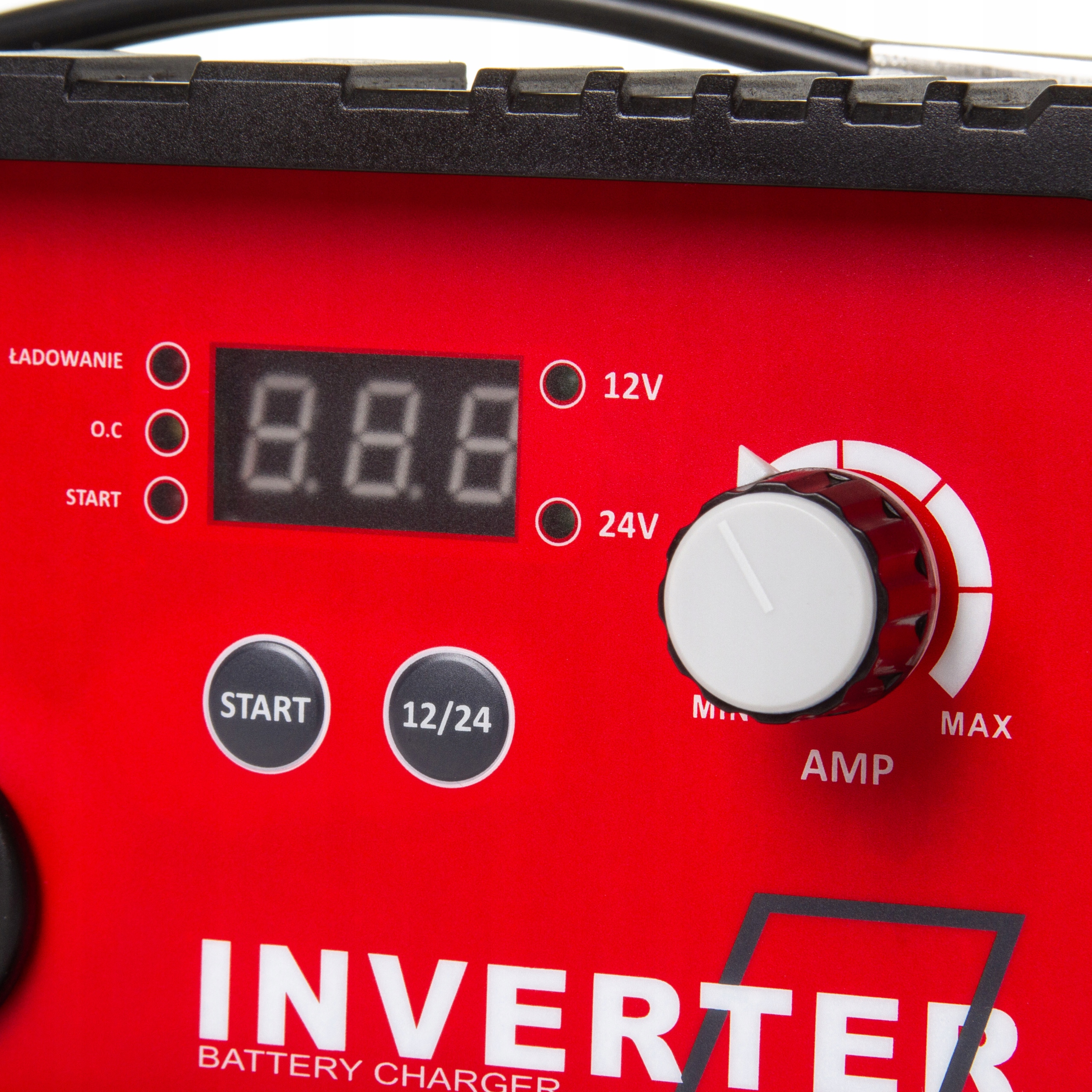 Prostownik inwerterowy MAR-POL® został wyposażony w niezwykle prosty i przejrzysty panel sterowania z wyświetlaczem LED, diodami sygnalizacyjnymi i potencjometrem.