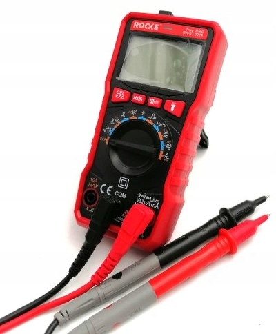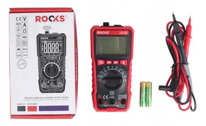 ROOKS oferuje doskonałe urządzenie do badania podstawowych parametrów prądowych w instalacjach elektrycznych o napięciu do 600V. Jest to multimetr cyfrowy z dużym wyświetlaczem LCD o szerokości 4 cyfry oraz automatycznym wyborem zakresów pomiarowych. Instrument posiada stabilną wydajność, wysoką precyzję, wysoką niezawodność oraz funkcję ochrony przed przeciążeniem. Zasilany jest bateriami 1,5 V 2xAAA. Jest mały i łatwy w przenoszeniu, posiada podświetlanie ekranu LCD oraz dodatkową, wbudowaną latarkę do podświetlania miejsca pomiaru. Multimetr dokładnie mierzy następujące wartości prądowe: napięcie AC/DC, natężenie stałe DC, rezystancję, częstotliwość, pojemność, napięcie o zmiennej częstotliwości (V.F.C.), diody, test obwodu, wykrywanie przewodu zerowego, bezdotykowe wykrywanie napięcia i rzeczywistą wartość prądu przemiennego AC.