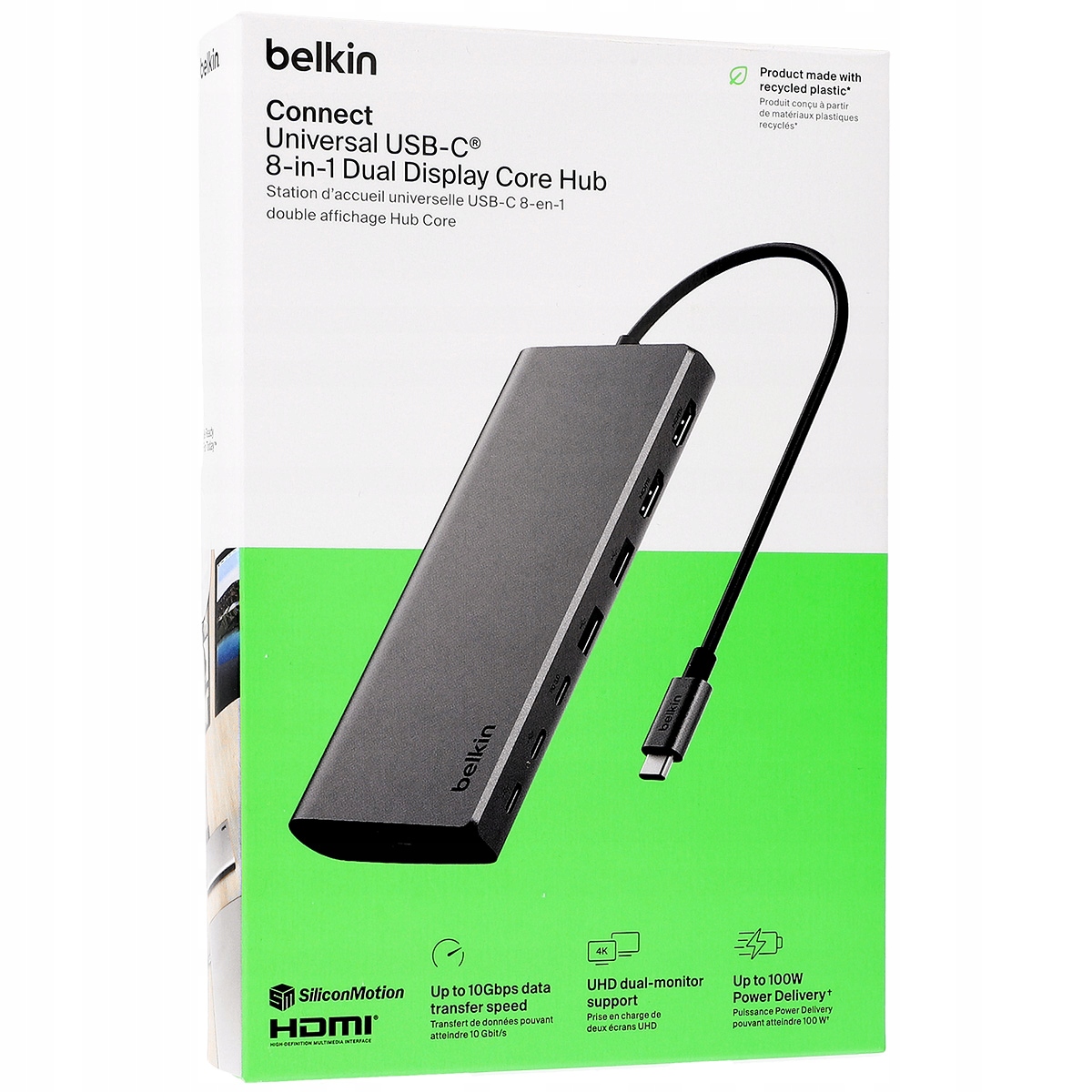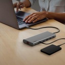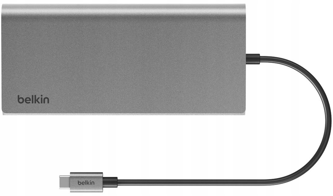 Rozbudowany hub firmy Belkin z wbudowanym kablem USB-C 22cm, który po podłączeniu do portu USB-C w laptopie służy do podłączenia dodatkowych urządzeń zewnętrznych.