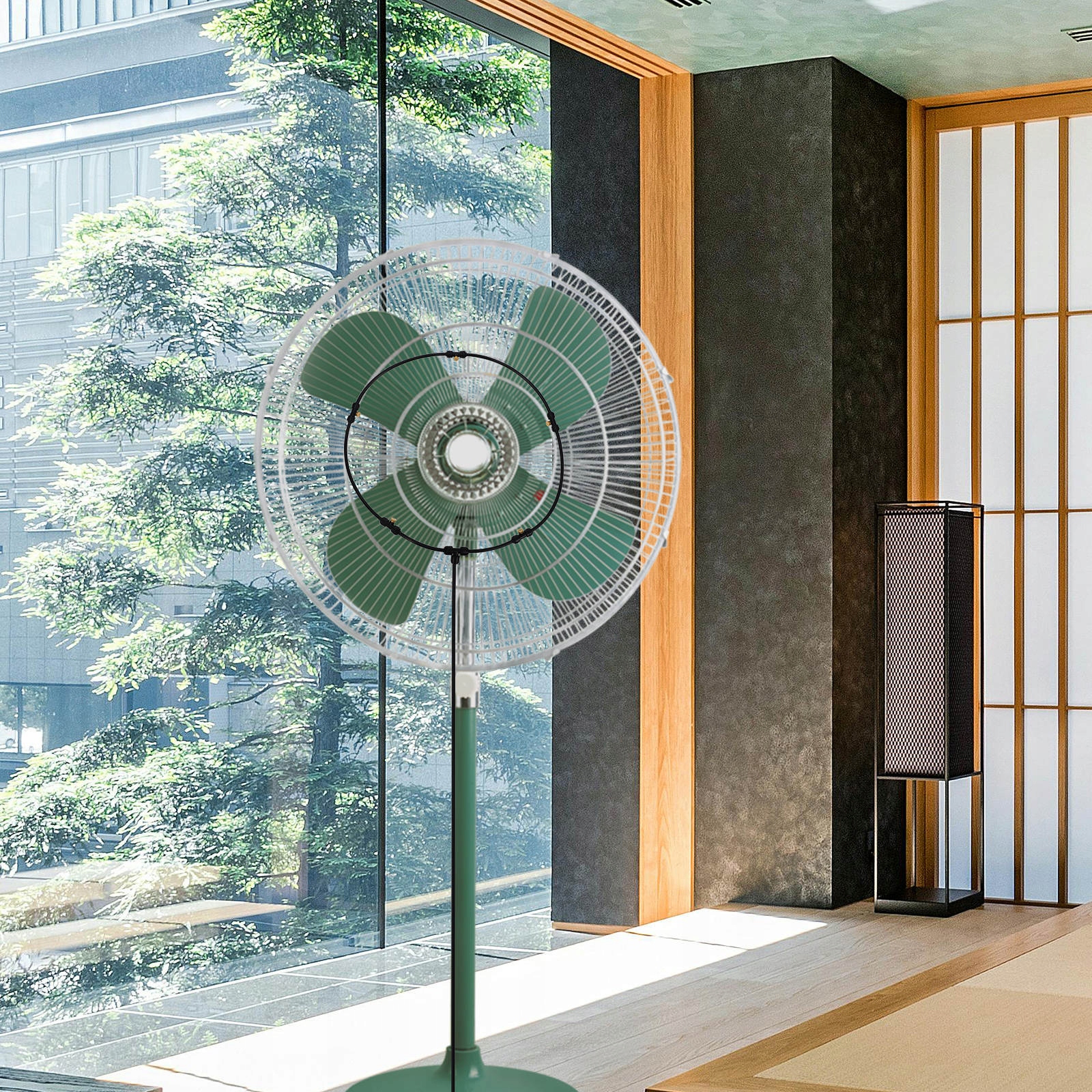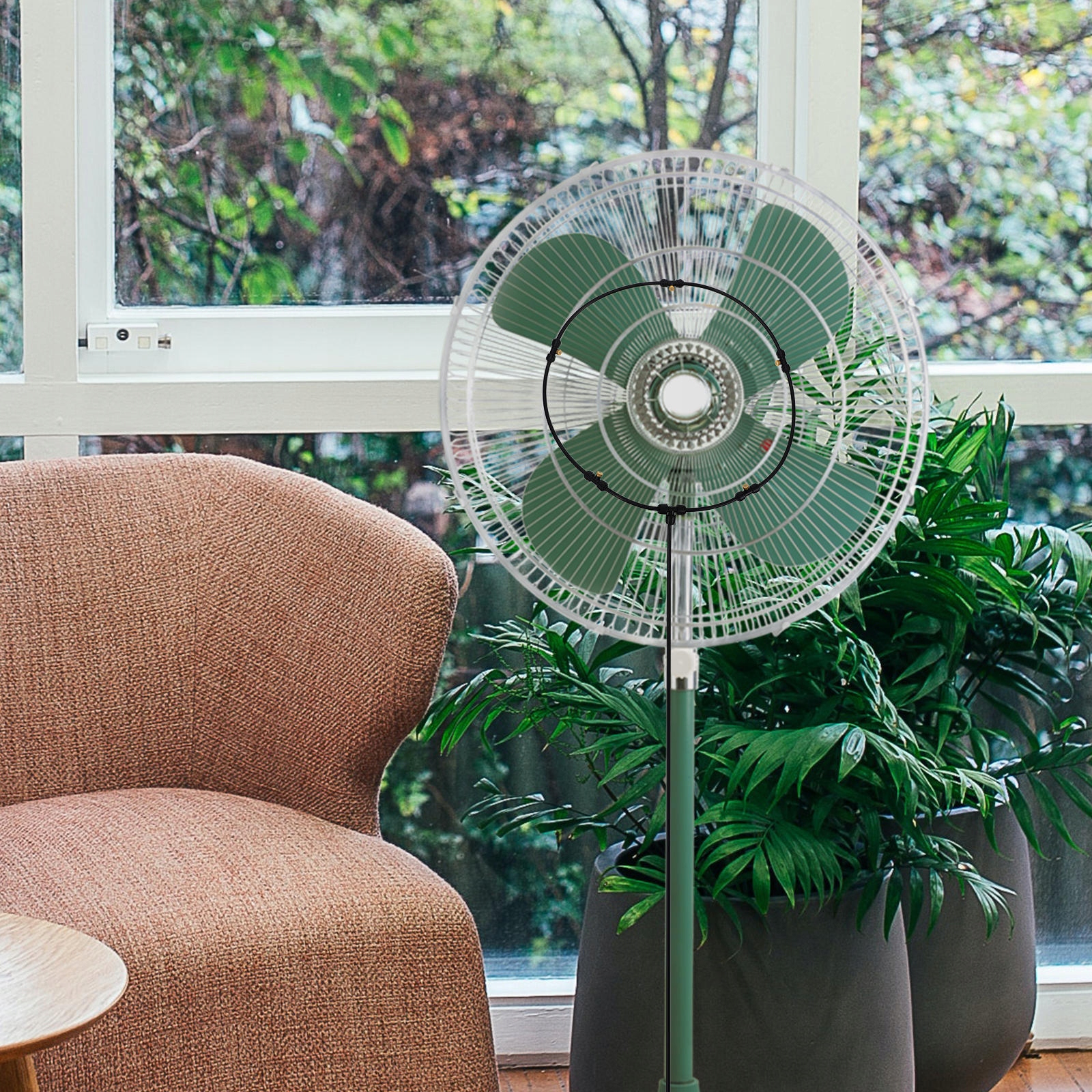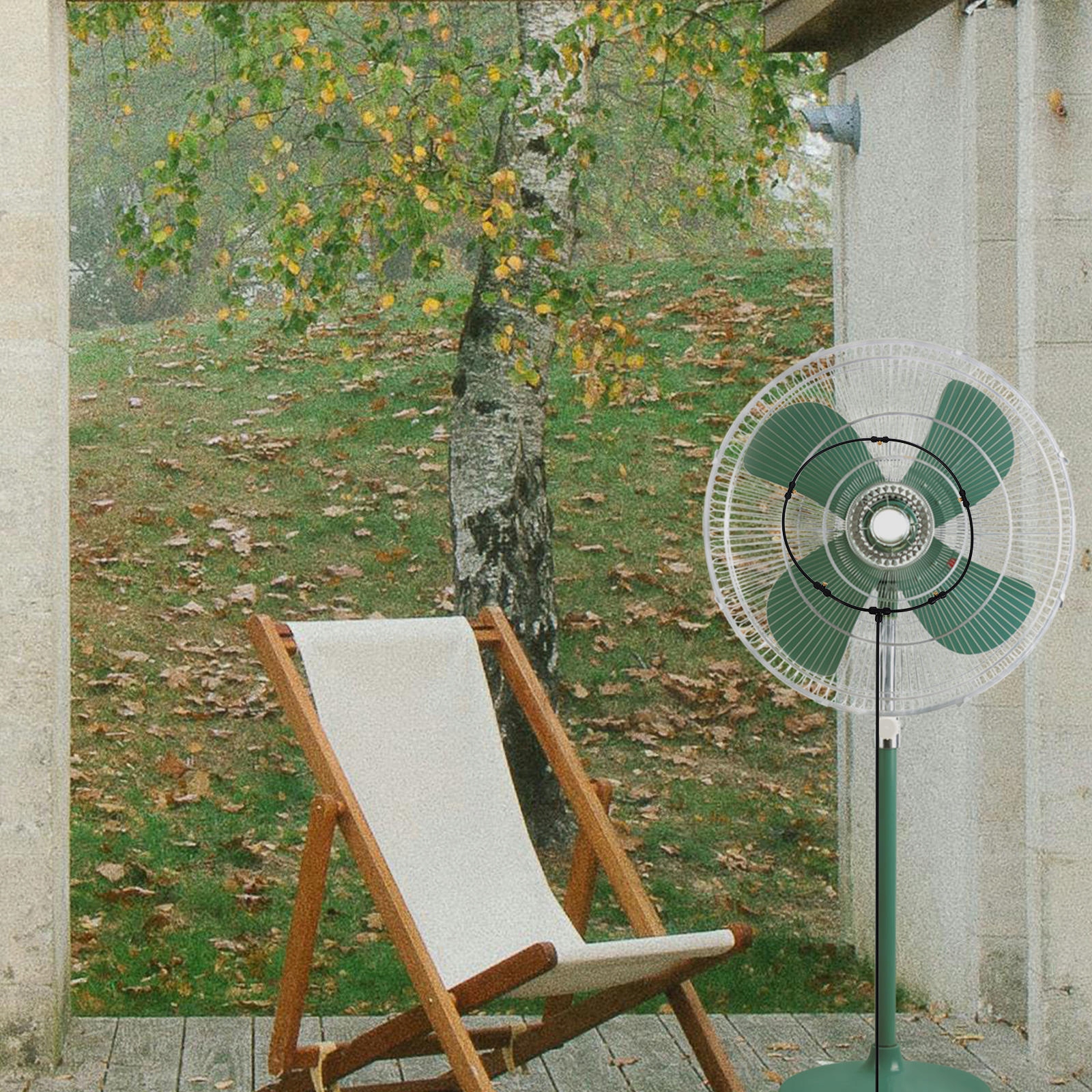 ✅Po prostu przymocuj mister do wentylatora tarasowego i podłącz gwintowany adapter do kranu.