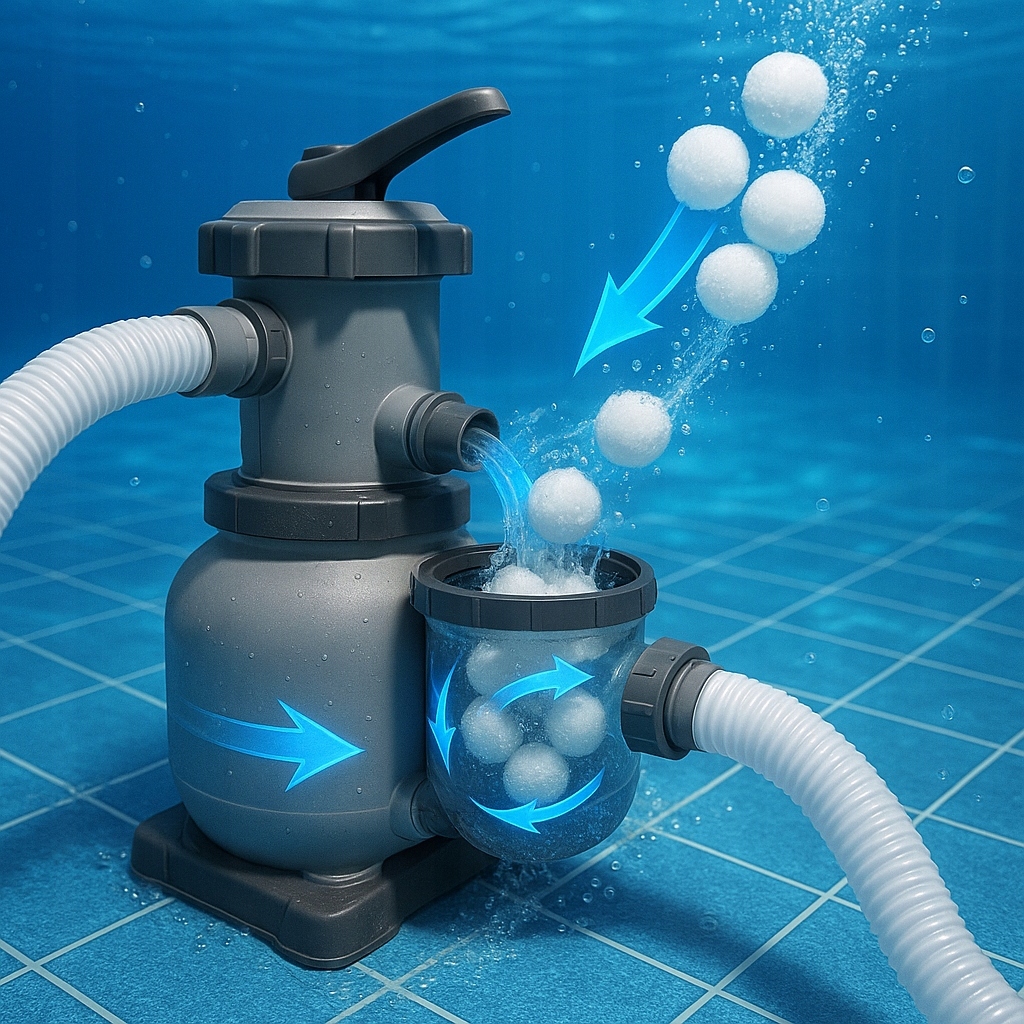 • ➡️ Po zakończeniu sezonu lub gdy filtracja jest mniej efektywna – wyjmij kulki i przepłucz je pod wodą lub wypierz.