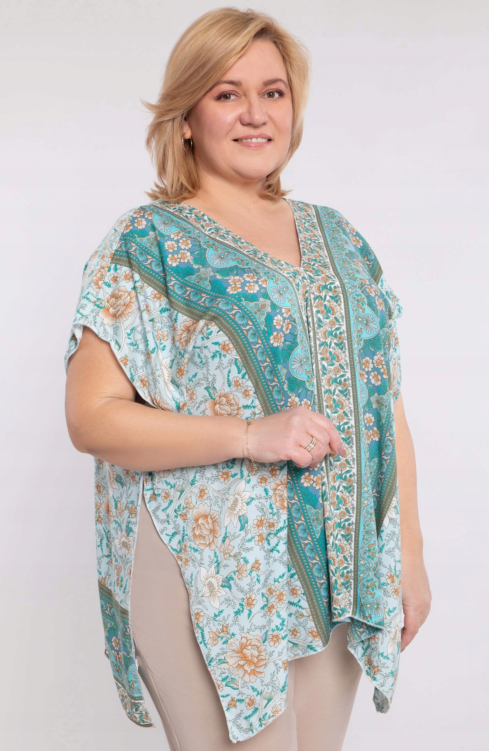 Rozmiar 46-56 obwód w biuście 162 cm , obwód w biodrach 172 cm , długość 77 cm , długość rękawa 32 cm , biceps 64 cm