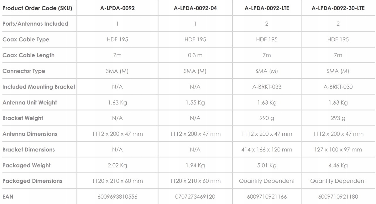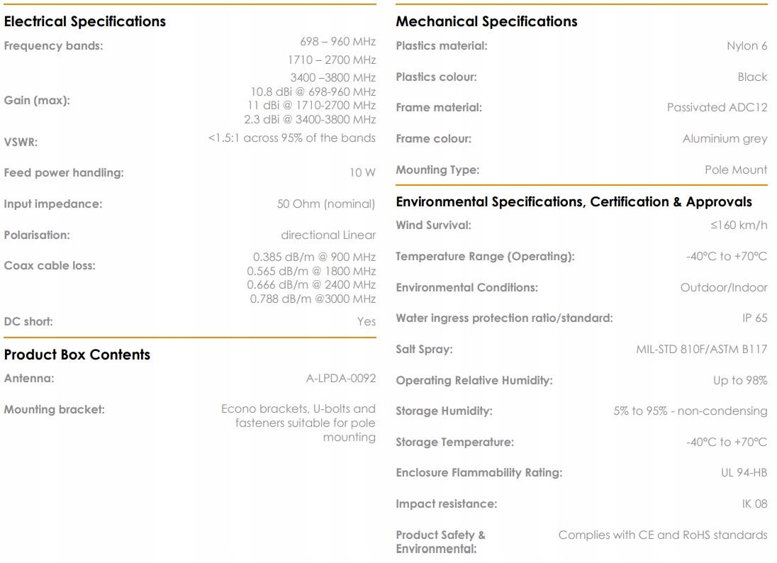 LPDA-92-LTE to zestaw dwóch anten szerokopasmowych o dużym zysku, obsługująca pasma GSM 900/GSM1800/UMTS/LTE. Jej parametry pozwalają na komunikację bezprzewodową dla różnych systemów. Anteny są niezywkle trwałe i pozwalają na pracę nawet w ekstremalnych warunkach pogodowych.