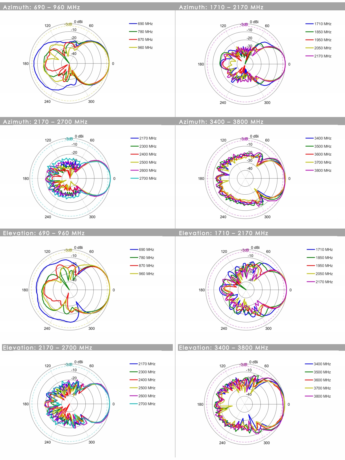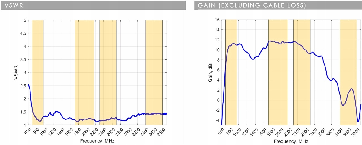 11 dBi to szczytowe wzmocnienie we wszystkich pasmach od 698 do 3800 MHz.