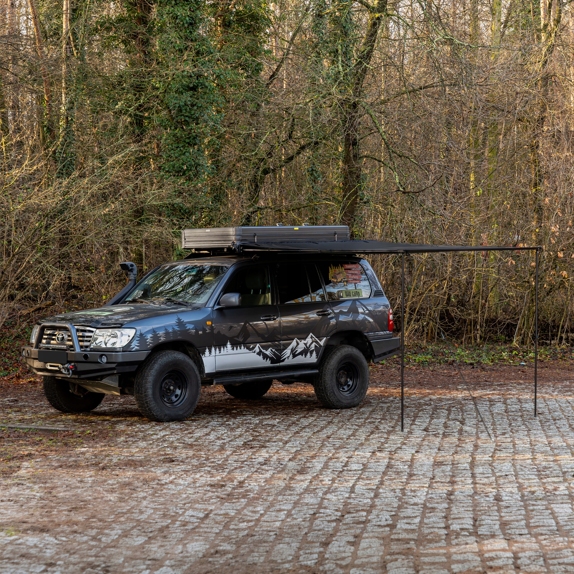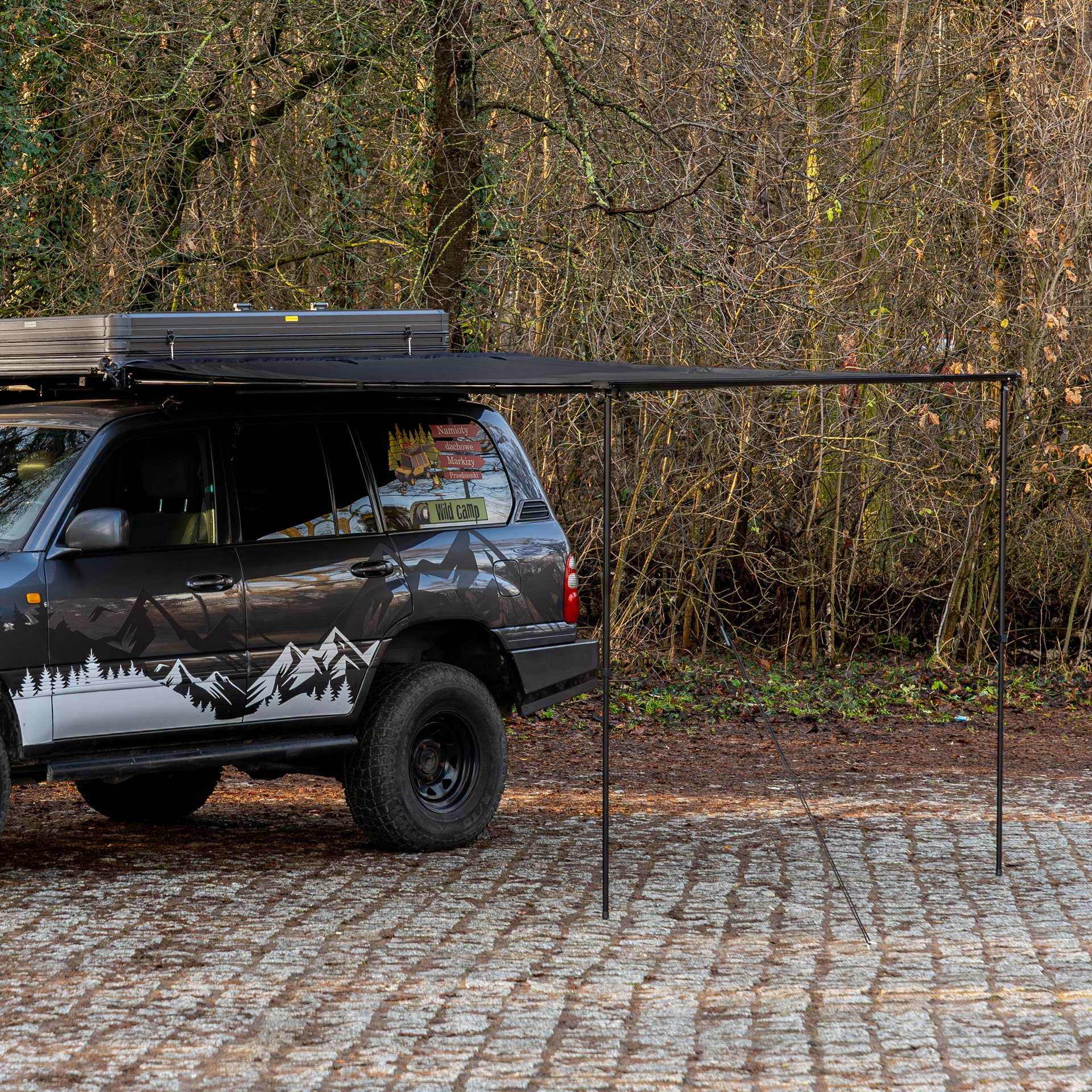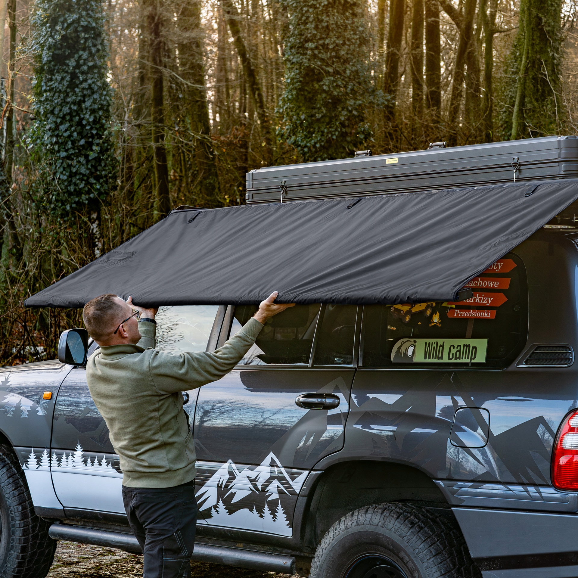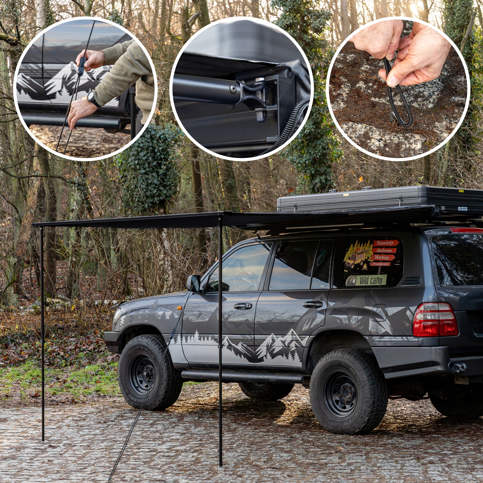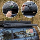 Markiza samochodowa marki Wild Camp została zaprojektowana, by jej zamontowanie na samochodzie było łatwe oraz intuicyjne.