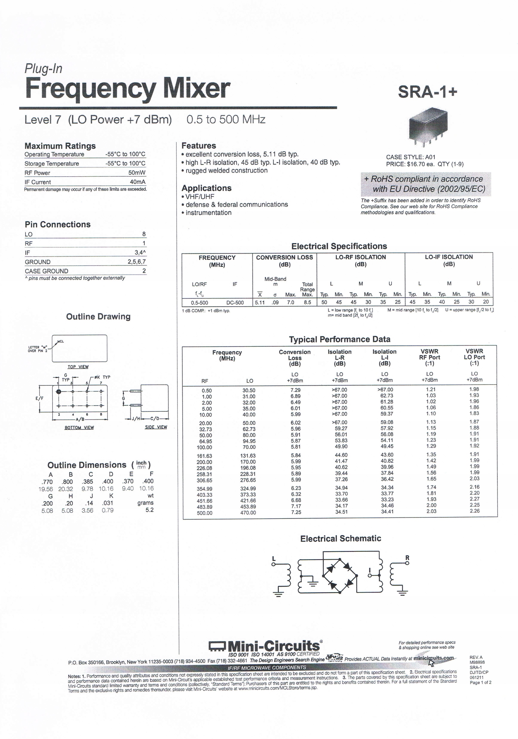 Oferujemy Państwu diodowy mieszacz zrównoważony typu SRA-1, produkcji amerykańskiej firmy Mini Circiucts Laboratory.