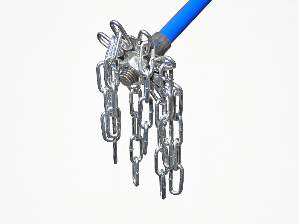 GŁOWICA ŁAŃCUCHOWA - to zaawansowana głowica czyszcząca, posiadająca 8 łańcuchów czyszczących. Jest to bardzo dobre rozwiązanie w kominach murowanych z cegły lub kominach ceramicznych. Głowica po rozkręceniu się rozszerza łańcuchy siłą odśrodkową i czyści nawet najtwardszą sadzę i zabrudzenia. Jest bardzo skuteczna w usuwaniu starej i nawarstwionej sadzy, kreozotu. Można również nią podfrezować wystającą z pomiędzy cegieł zaprawę. Nadaje się również do czyszczenia ceramicznych wkładów kominowych. Nie uszkadza cegieł i wkładów ceramicznych.