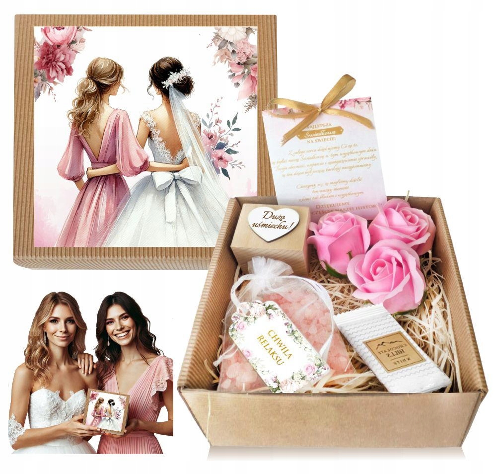 Elegancka skrzynka z dedykacją dla świadka, która jest wypełniona różnymi upominkami.