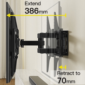 Konstrukcja ramienia przegubowego pozwala na złożenie telewizora o 70 mm od ściany, co oszczędza miejsce i rozszerzenie do 386 mm dla lepszego kąta widzenia.