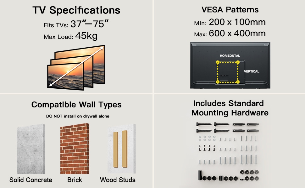 Uchwyt ścienny do telewizora można zamontować również na ścianach betonowych lub ceglanych za pomocą dołączonych kotew. Nie montuj samodzielnie na płycie gipsowo-kartonowej lub płycie ściennej.