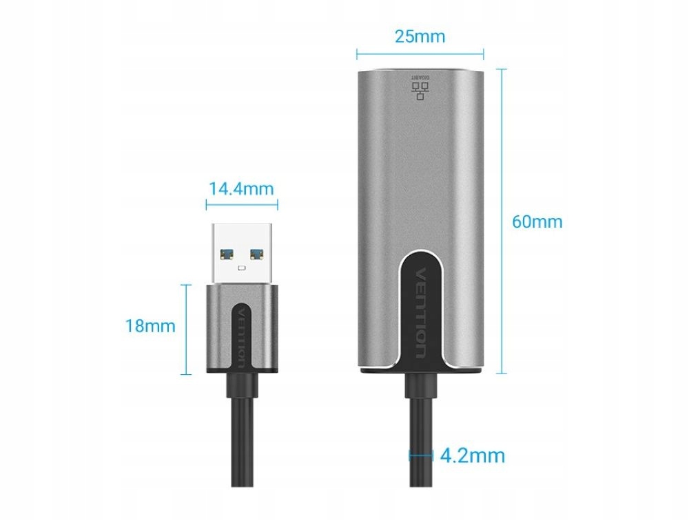 Gigabitowy adapter Ethernet CEWHB od Vention umożliwia podłączenie komputera lub tabletu do routera, modemu lub przełącznika sieciowego z wtykiem męskim A na żeński RJ45 w celu uzyskania stabilnego połączenia sieciowego. Użytkownik zyskuje dostęp do pełnej prędkości Gigabit Ethernet (10/100/1000 Mbps) na laptopach, komputerach stacjonarnych, konsolach i innych urządzeniach. Model CEWHB sprawdza się w zastosowaniach wymagających szybkiego transferu danych, streamingu w wysokiej rozdzielczości czy dynamicznej gry online.