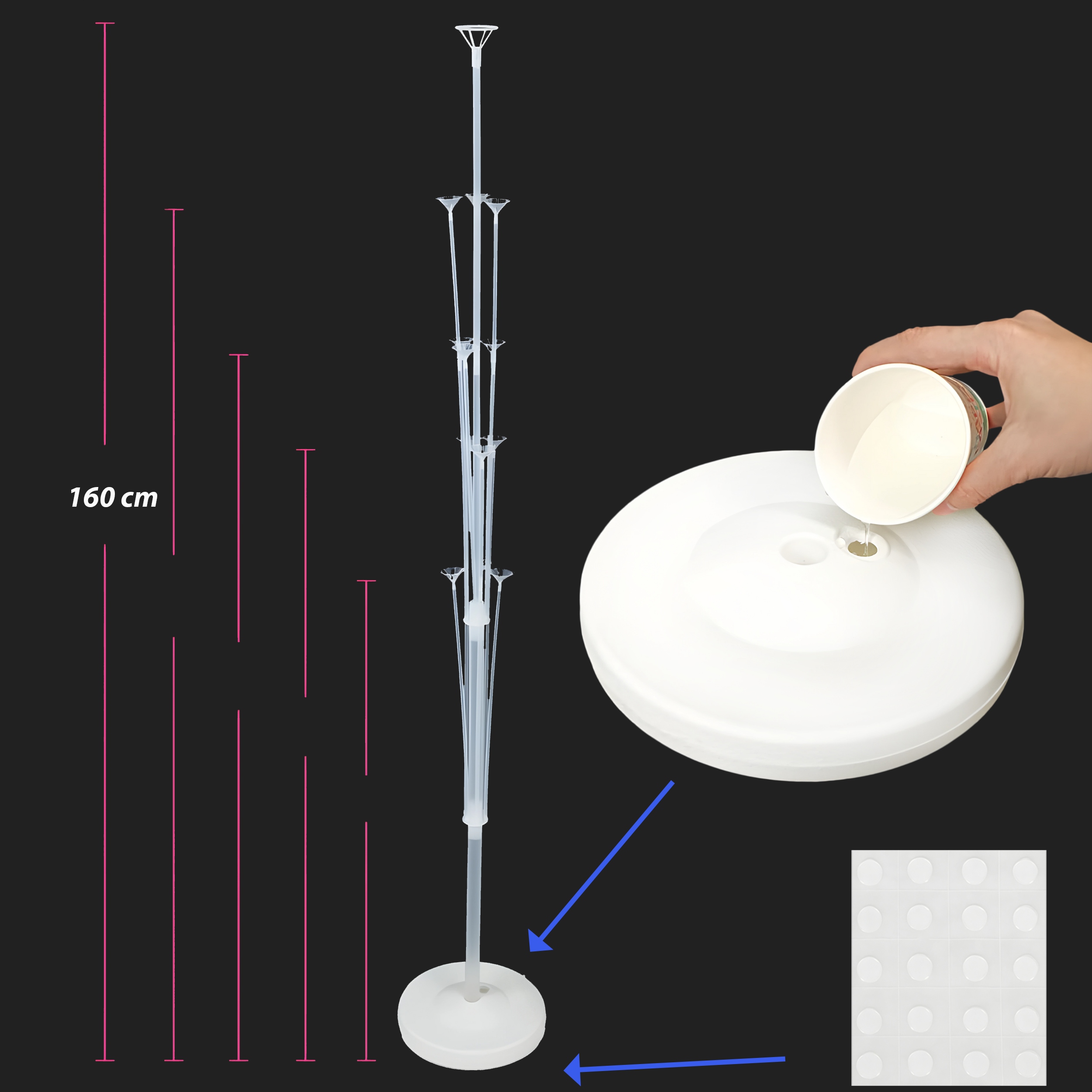 Każdy stojak po złożeniu ma aż 160 cm wysokości, co pozwala tworzyć naprawdę spektakularne aranżacje balonowe widoczne z daleka.
