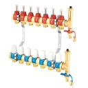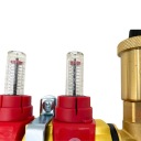 Rozdzielacz wyposażony w rotametry, zawory termostatyczne, odpowietrznik oraz zawór spustowy — gotowy do montażu w instalacji.