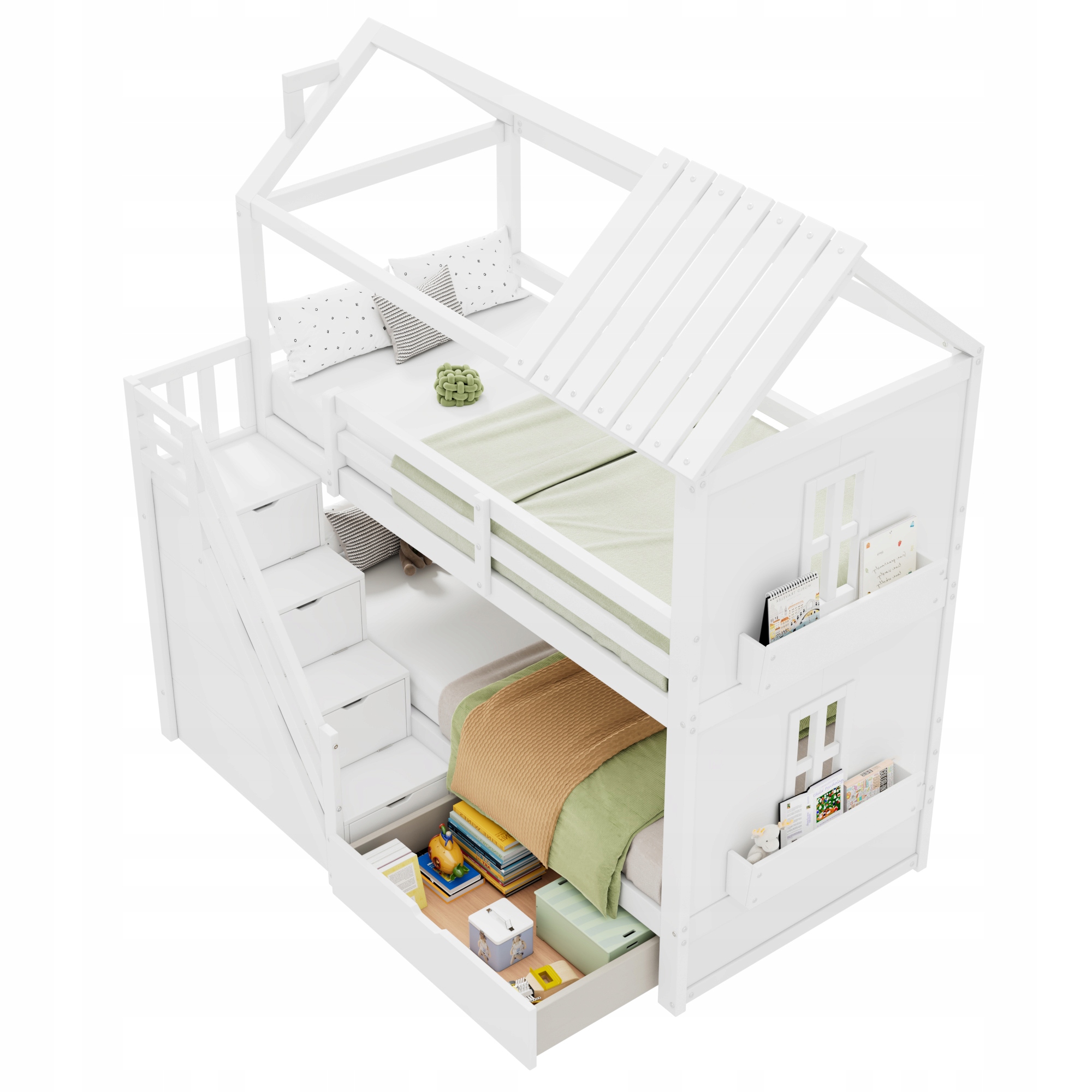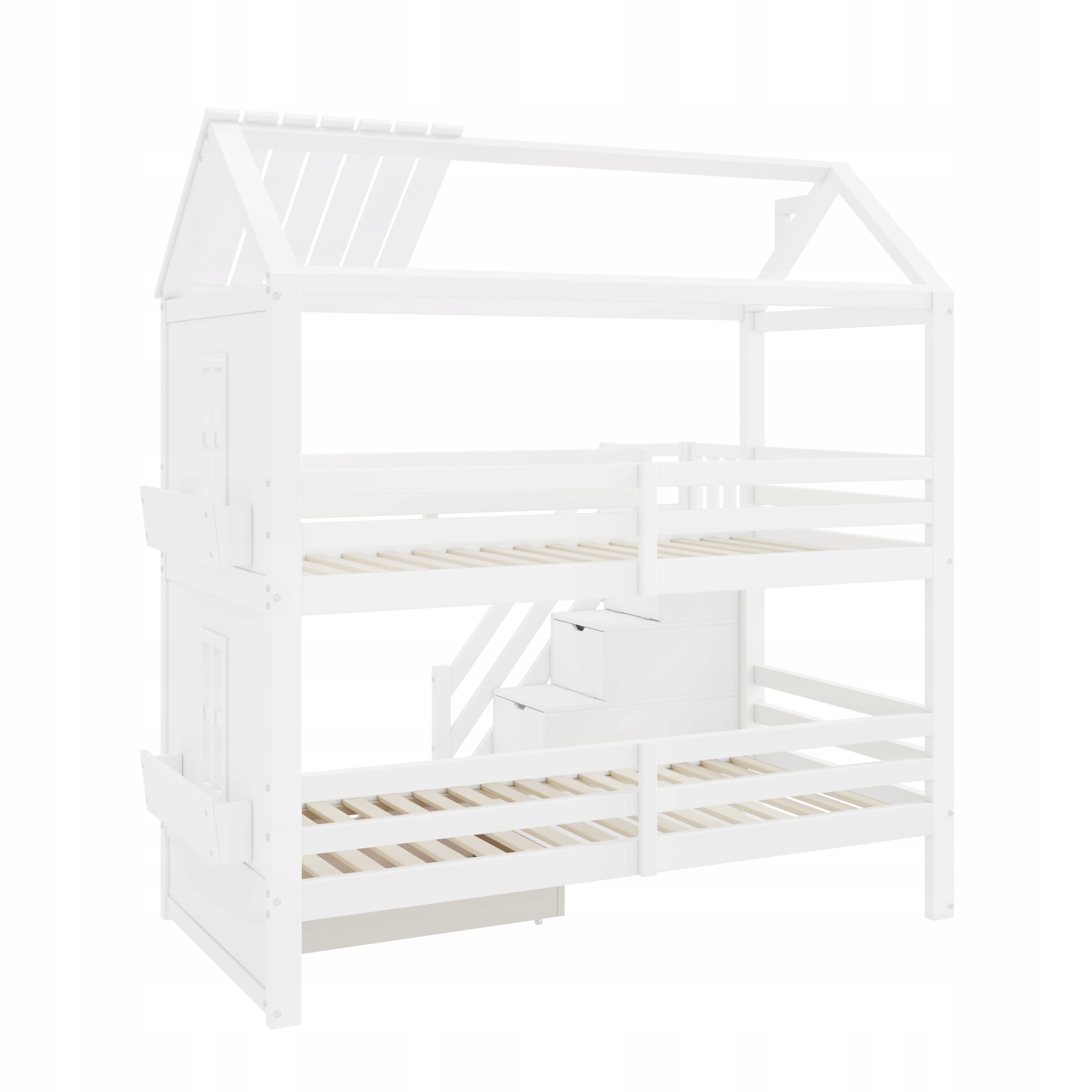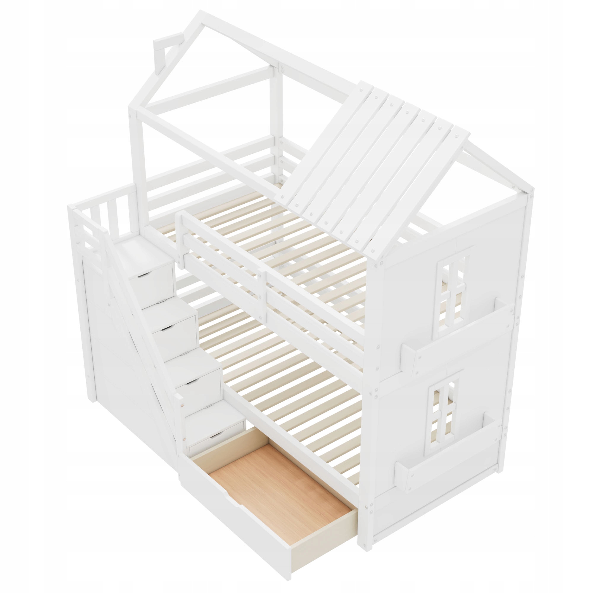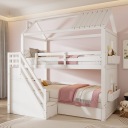 Bardzo duża przestrzeń do przechowywania: Szuflady pod łóżkiem i schodami zapewniają dużo miejsca do przechowywania, ułatwiając rodzicom i dzieciom organizowanie różnych przedmiotów oraz poprawiając porządek i wydajność pokoju.