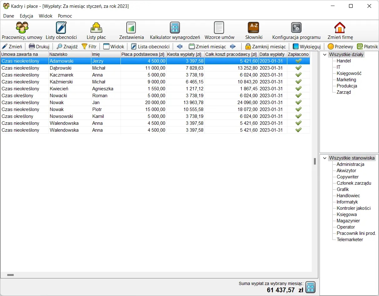 Kadry i płace to program kadrowo-płacowy przeznaczony dla firm lub organizacji zatrudniających pracowników. Umożliwia prowadzenie bazy pracowników i umów, wyliczanie list płac oraz prowadzenie ewidencji czasu pracy. Obsługuje wszystkie rodzaje umów o pracę oraz umowy zlecenia i o dzieło oraz pozwala tworzyć wszelkie dokumenty związane z zatrudnieniem i prowadzeniem niezbędnej dokumentacji pracowniczej. Możliwość wysyłania danych do ZUS, e-Deklaracji do urzędu skarbowego oraz danych do systemów PPK i banków czyni z niego kompleksowy program kadrowy. Dzięki częstym aktualizacjom daje gwarancję zgodności z aktualnymi przepisami prawa. Opcje zestawień graficznych i tabelarycznych pozwalają na tworzenie rozmaitych raportów dających wgląd w aktualną sytuację kadrową.Funkcjonalność:Ewidencja pracowników i umów