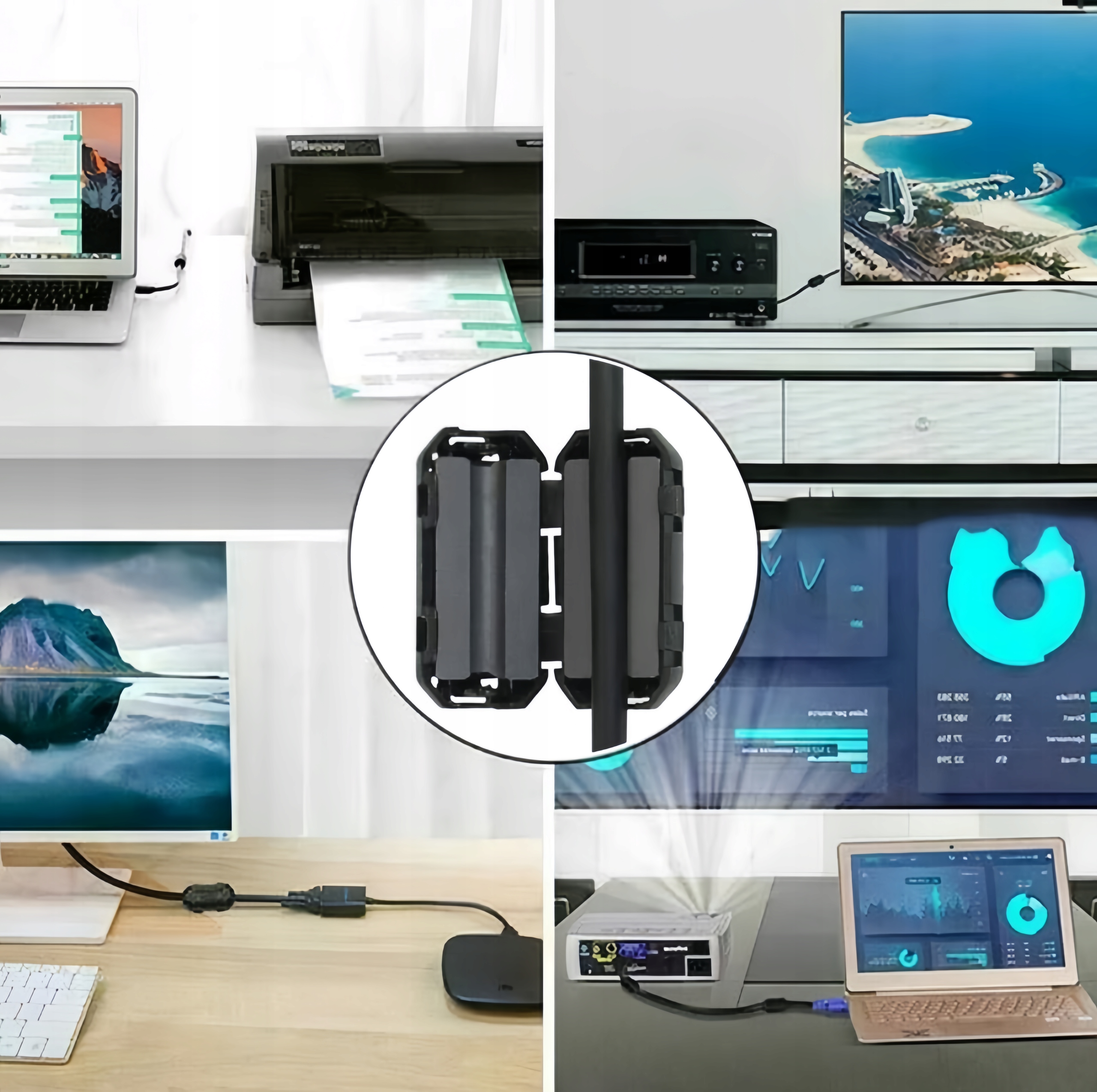 Przypinane rdzenie ferrytowe: Rdzeń ma małe zaciski, można go łatwo otworzyć i przypiąć do kabla.