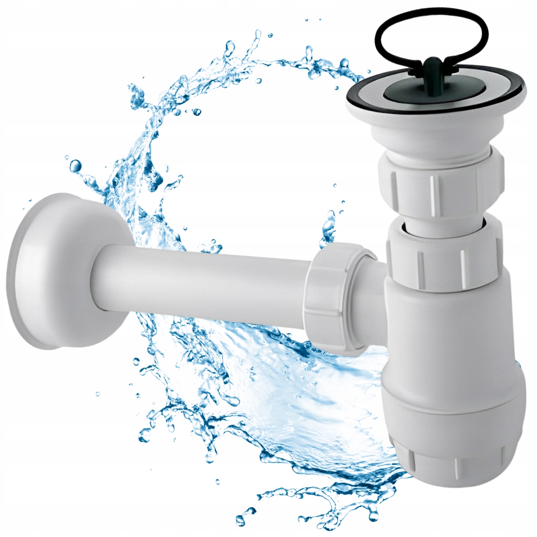 Niski, butelkowy syfon umywalkowy ze spustem, z sitem ze stali nierdzewnej i korkiem gumowym.