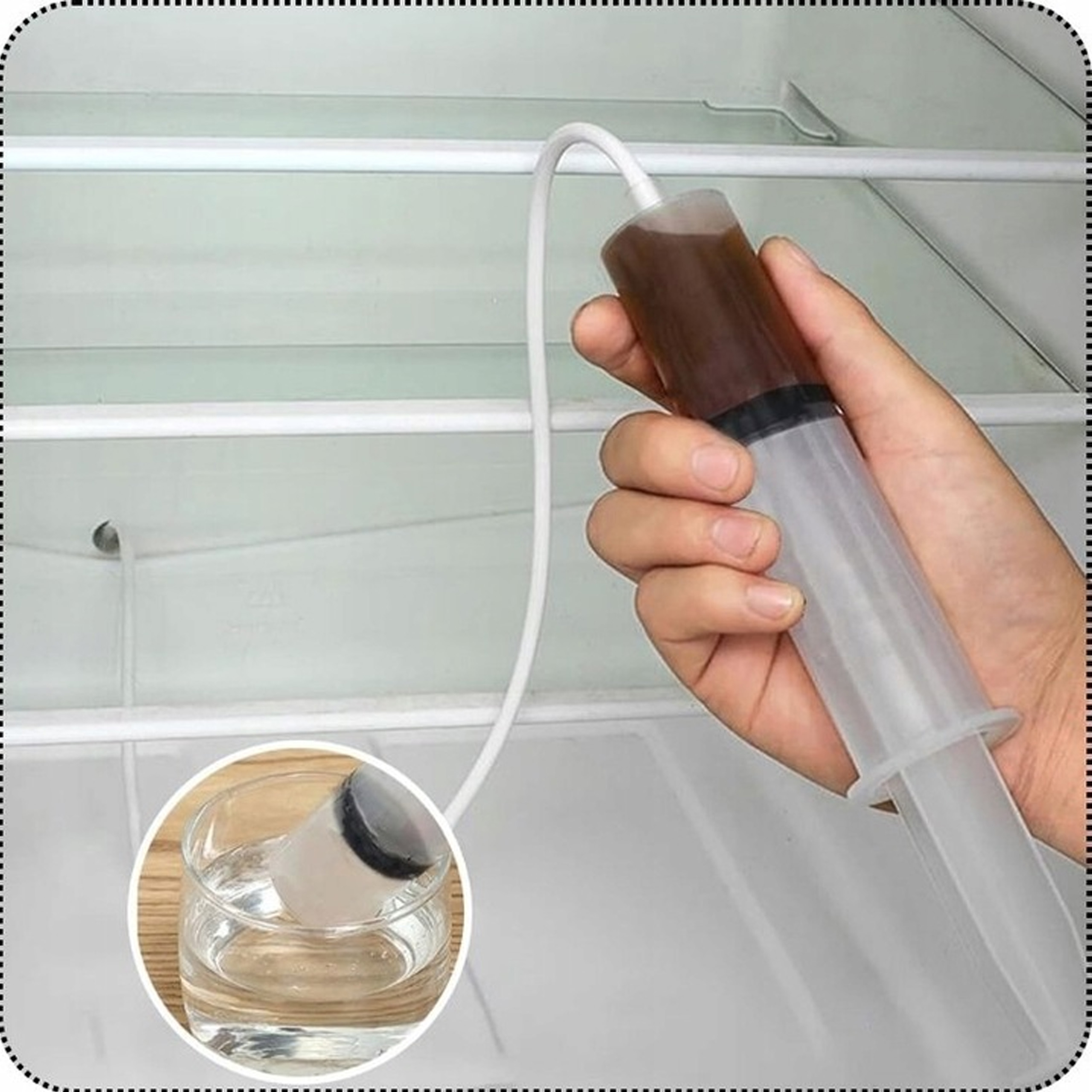 Strzykawka i wężyk umożliwiają dokładne oczyszczenie trudno dostępnych miejsc, usuwając resztki jedzenia i tłuszczu.
