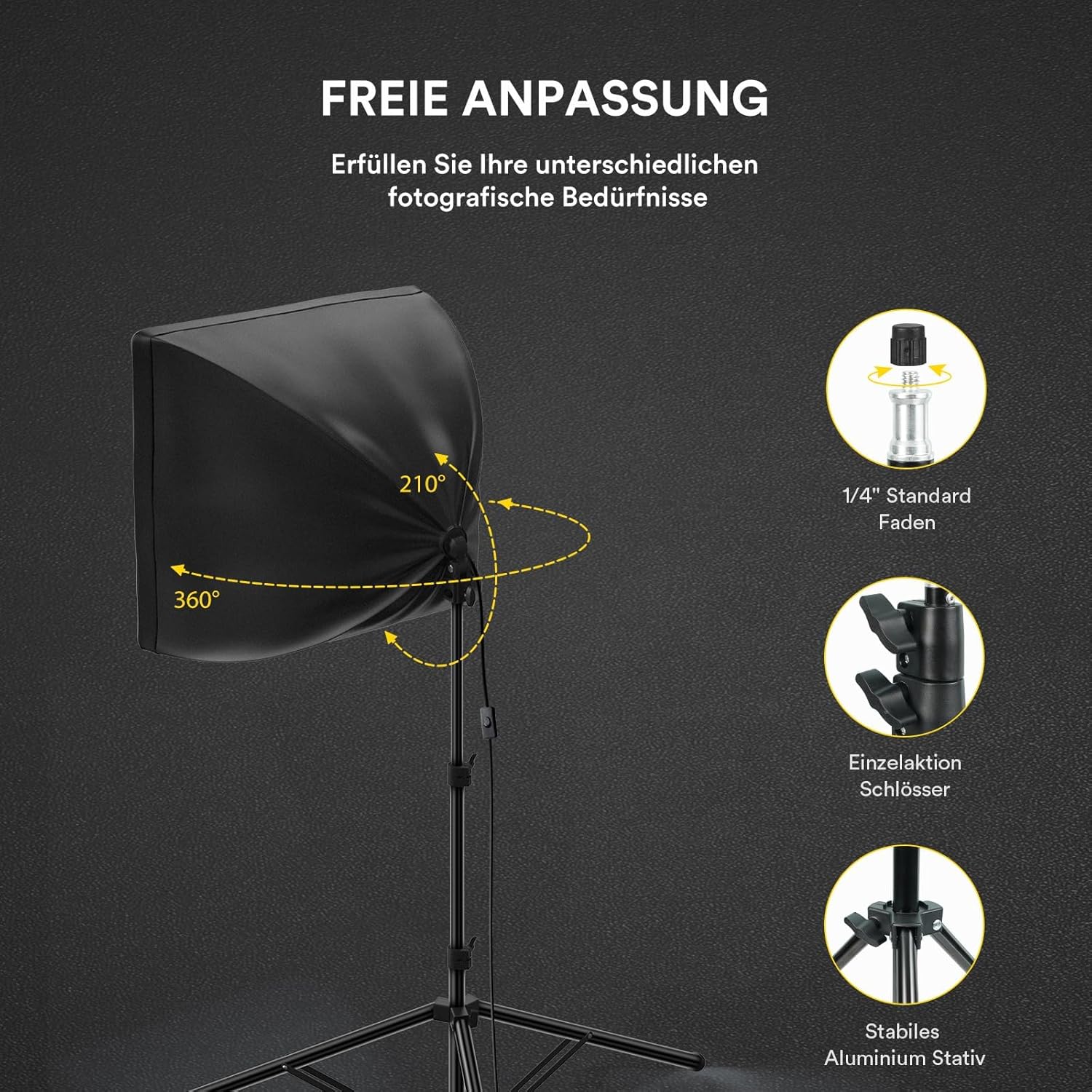 Obracana o 210° Obudowa Softboxa i Regulowany Statyw: Dzięki niezależnej blokadzie softbox można obracać o 210°, aby spełnić różne potrzeby fotograficzne. Stojak na lampę ze stopu aluminium zapewnia dobrą wytrzymałość i stabilność. 3-częściowa konstrukcja kolumny, składana do 68 cm i rozkładana do 200 cm. Idealny do stosowania w Twoim studiu. Najlepszy wybór dla entuzjastów fotografii, początkujących, półprofesjonalnych i profesjonalnych fotografów