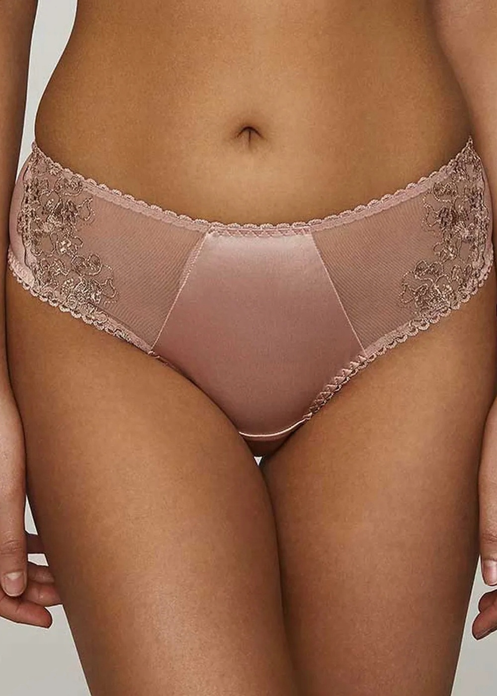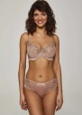Seksowne stringi damskie Emilia producenta bielizny damskiej Dalia w kolorze mocca. Model wykonane zostały z oddychającej mikrofibry oraz zdobionego elastycznym haftem tiulu z delikatnym motywem roślinnym. Przód uszyty z mikrofibry i haftu a tył wyłącznie z elastycznego haftu. Idealnie dopasowują się do sylwetki podkreślają atuty kobiecych kształtów, eksponują pośladki. Kroczek wykończony bawełną dla lepszego komfortu użytkowania.