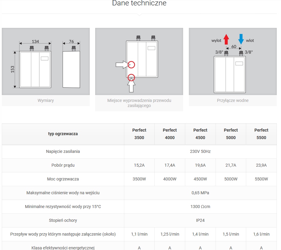 Elektryczny przepływowy podumywalkowy ogrzewacz wody Perfekt 3,5 kW od firmy WIJAS zasilany napięciem 230V.