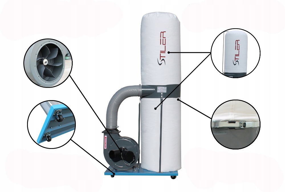☑️ Odciąg wiórów i trocin STILER FM300 dzięki kompaktowym rozmiarom i mocnej konstrukcji znajdzie zastosowanie w każdym warsztacie stolarskim. Przystosowany jest do współpracy z maszynami stolarskimi, przy obróbce drewna.