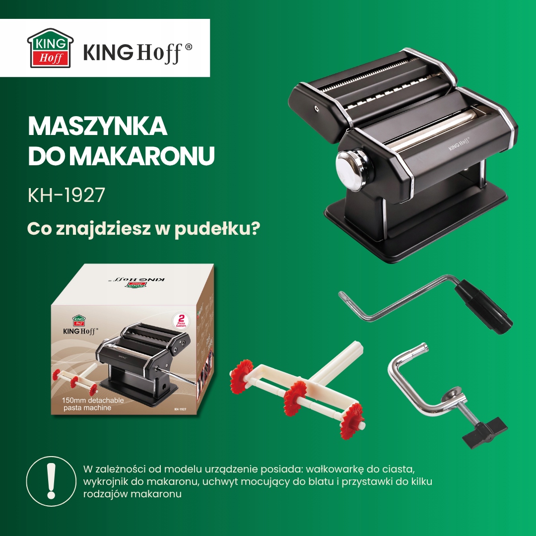 Maszynka KINGHoff KH-1927 to gwarancja domowego smaku, jakości i trwałości. Jest nie tylko praktyczna, ale i stylowo zaprojektowana – doskonale prezentuje się w każdej kuchni. Dzięki niej w kilka minut przygotujesz świeży makaron bez konserwantów.