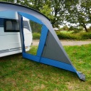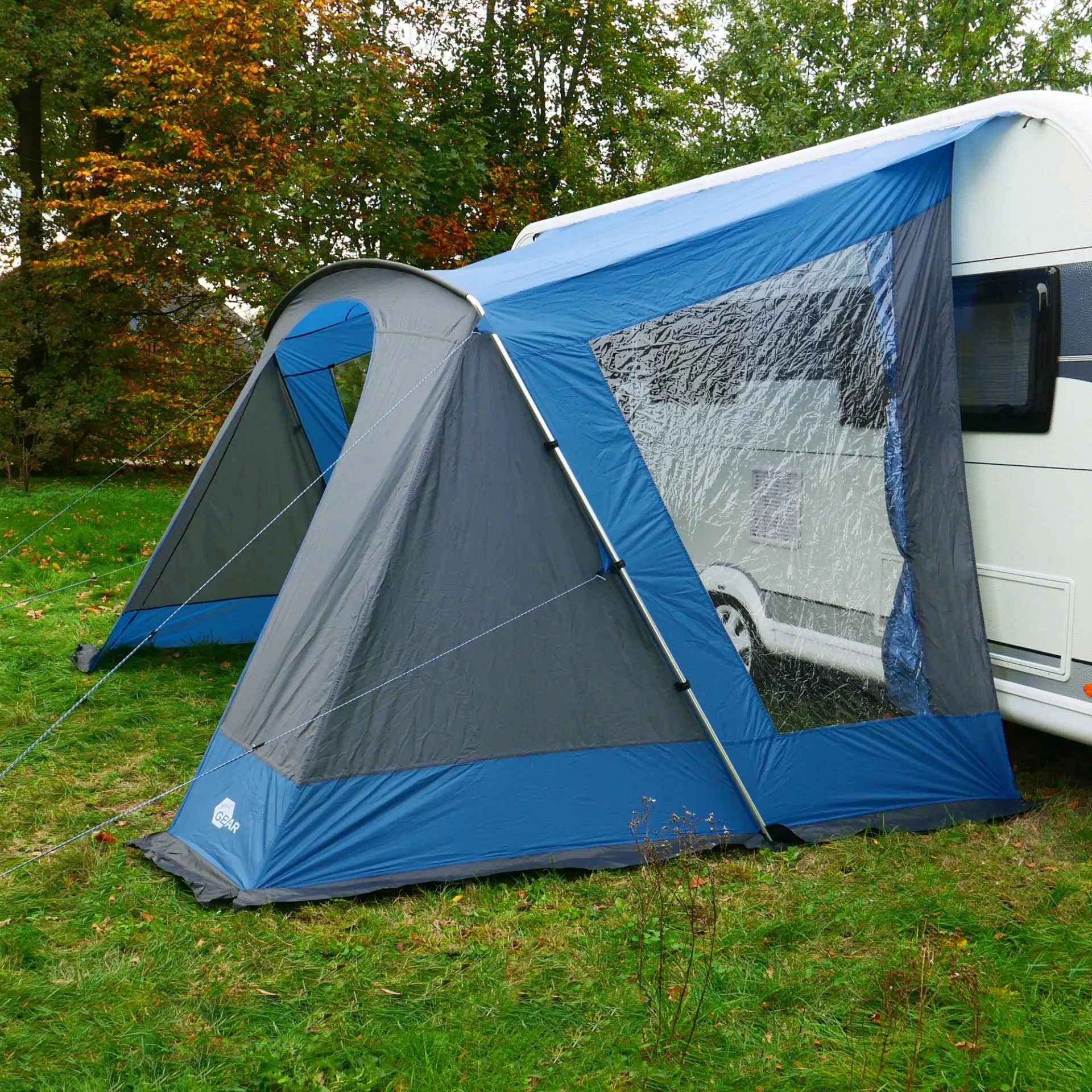 Markiza do przyczep kempingowych i kamperów z dwoma panoramicznymi oknami i aluminiową ramą – szybki montaż, wysoka odporność i maksymalna wygoda na kempingu.