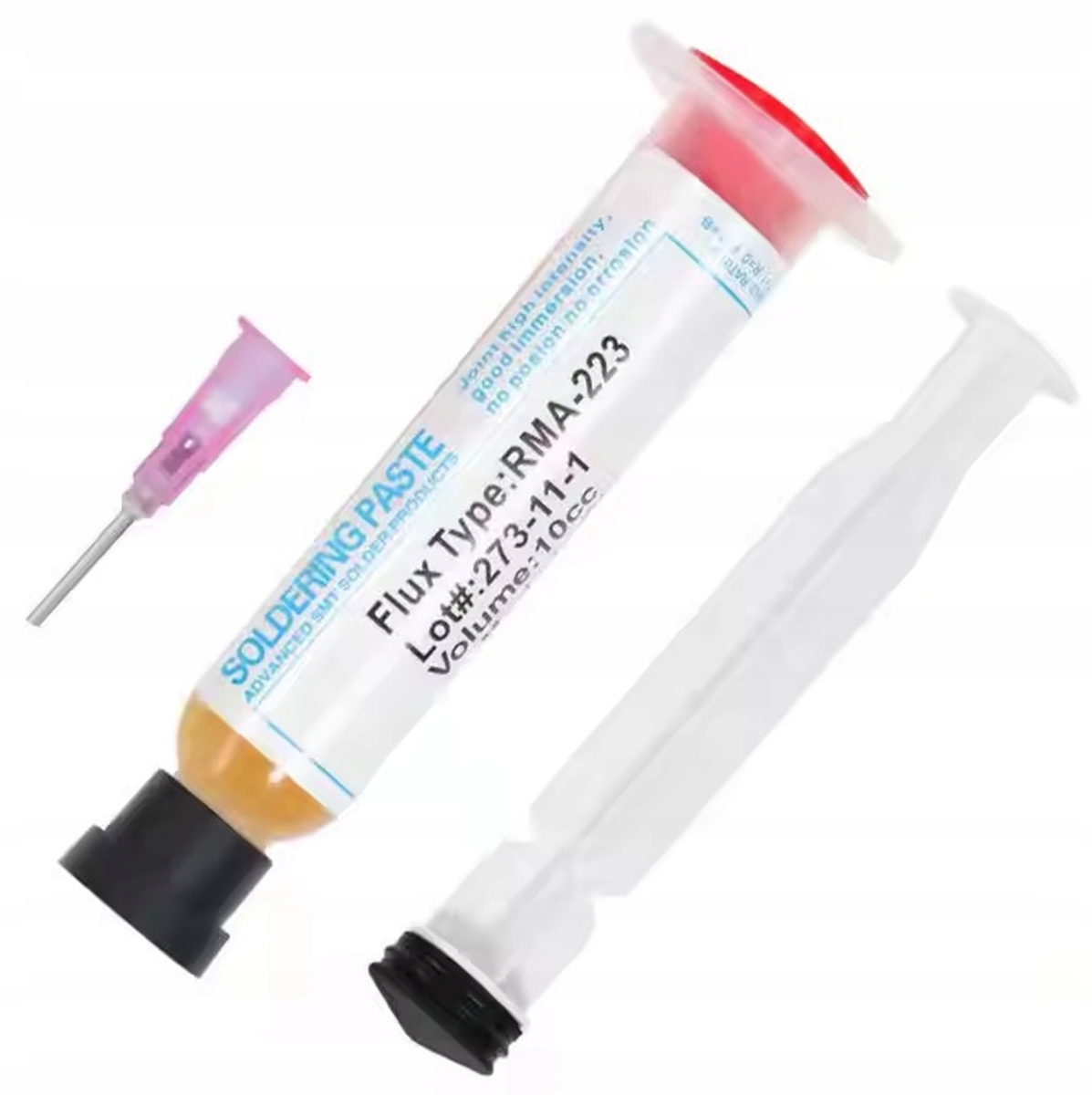 ✅ Zestaw do lutowania wyposażony w topnik lutowniczy (flux) typu RMA-223 10cc oraz tłoczek i igłę do jego dozowania 19G.