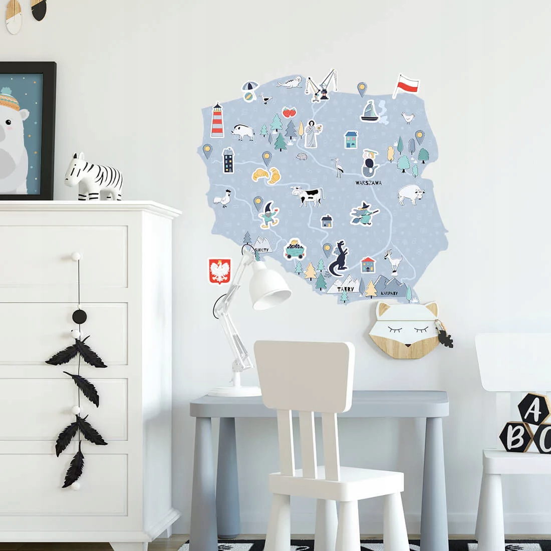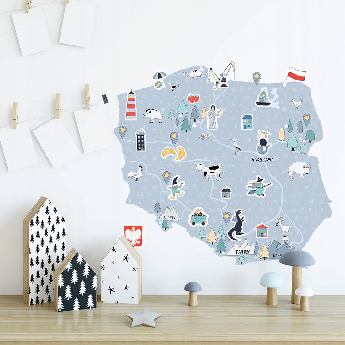 Kolorowa mapa Polski z dodatkowymi elementami oraz pinezkami do naklejania to dobra okazja do poznania topografii naszego kraju. Maluch może samodzielnie zaznaczać na niej miejsce zamieszkania swoich wujków, cioć i przyjaciół oraz miejsca, które planuje zwiedzić w przyszłości. Żurawie, Mikołaj Kopernik, Syrenka, Smok Wawelski - gdzie to wszystko powinno być? Niech Twoja pociecha samodzielnie spróbuje dopasować elementy do poszczególnych miast. Naklejki idealnie będą pasować nad łóżkiem malucha lub w kąciku zabaw, ochraniając ścianę przed zabrudzeniami.
