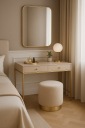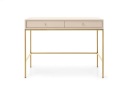Toaletka, konsola Mono MT104 wyróżnia się swoją unikalną formą podkreśloną przez złote, wysokie (65 cm) nóżki połączone z solidną, metalową ramą. Ten prestiżowy mebel wyposażony został w dwie eleganckie szufladki, których beżowo-piaskowe fronty zaopatrzone zostały w stylowe, złote uchwyty. Toaletka dostarczana jest w wersji zdemontowanej i wchodzi w skład programu meblowego o tej samej nazwie. Dostępna jest wersja z czarnymi stópkami i ramą.