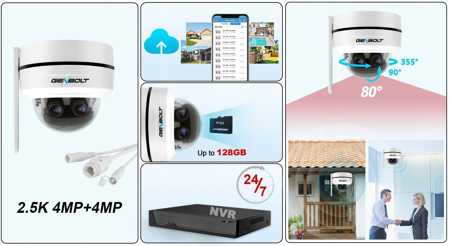 Wewnętrzna kamera bezpieczeństwa WIFI firmy GENBOLT zapewnia wysoką wydajność i solidną trwałość. Wyposażony w konstrukcję dual-lens, oferuje rozdzielczość 2.5K HD, 10-krotny zoom hybrydowy/4x zoom optyczny oraz automatyczne wykrywanie ludzi. Obsługując zarówno zasilanie PoE, jak i dwuzakresowe Wi-Fi dla elastycznej instalacji, może pochwalić się IK10 wandaloodpornym i odpornym na warunki atmosferyczne IP66, dzięki czemu nadaje się do różnych wymagających środowisk wewnętrznych i zewnętrznych. Dzięki opcjom przechowywania w chmurze i karcie SD (nie dołączonej do pakietu), natychmiastowym alertom i konfigurowalnym alarmom dźwiękowym zapewnia niezawodną ochronę bezpieczeństwa 24/7.