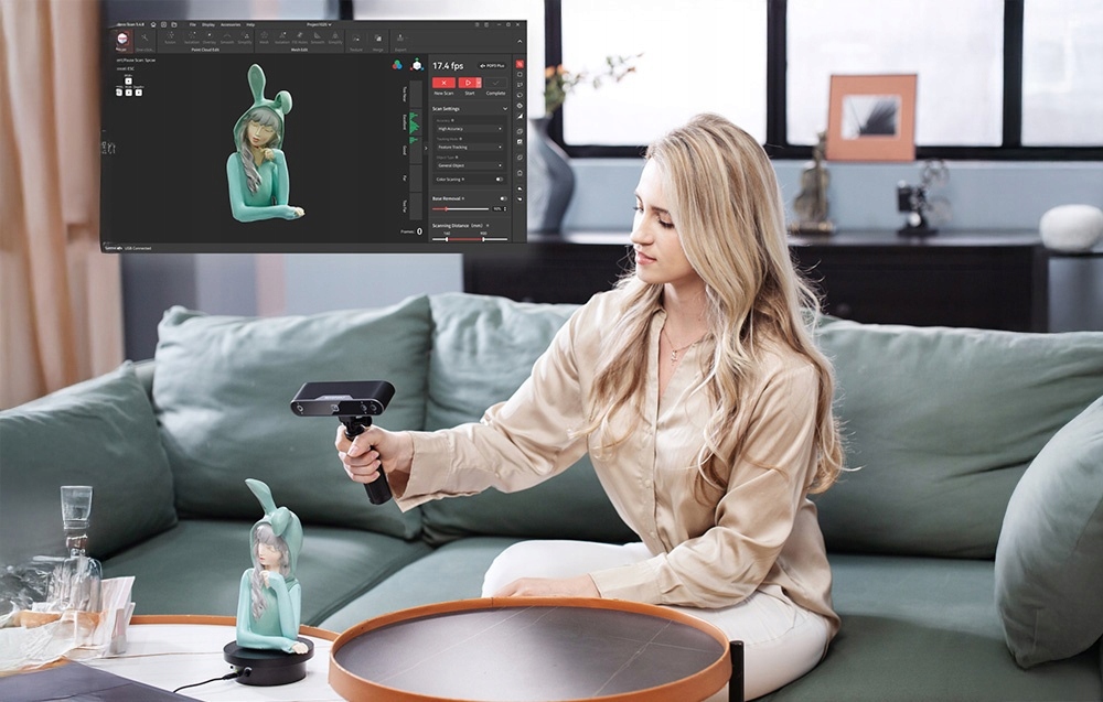 Dzięki prędkości skanu do 18 klatek na sekundę możesz błyskawicznie przejść od ustawienia obiektu do gotowego modelu 3D. Dwukrotne powiększenie optyczne znacząco zwiększa ostrość strukturalnego światła, co skutkuje o 30% lepiej odwzorowaną chmurą punktów w porównaniu z poprzednim modelem Pop 3. Natomiast wbudowana kamera HD RGB (Red, Green, Blue, czyli czerwony, zielony i niebieski) pozwala uzyskać realistyczne, pełnokolorowe tekstury, które dodatkowo wzbogacają cyfrowe odwzorowanie.