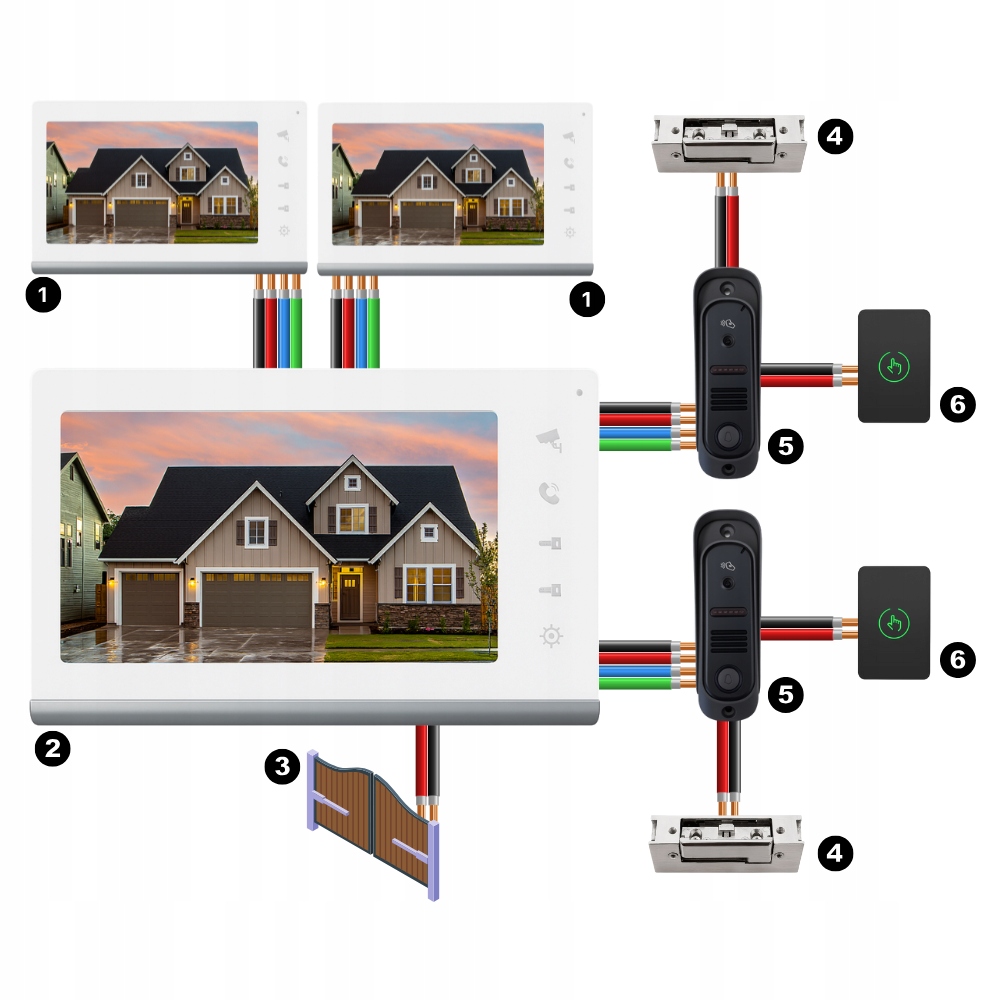 Cały system działa na czterożyłowej linii (zasilanie + audio-wideo). Wystarczy poprowadzić ją od jednostki głównej do paneli zewnętrznych i – w razie potrzeby – dalej do dodatkowych monitorów.