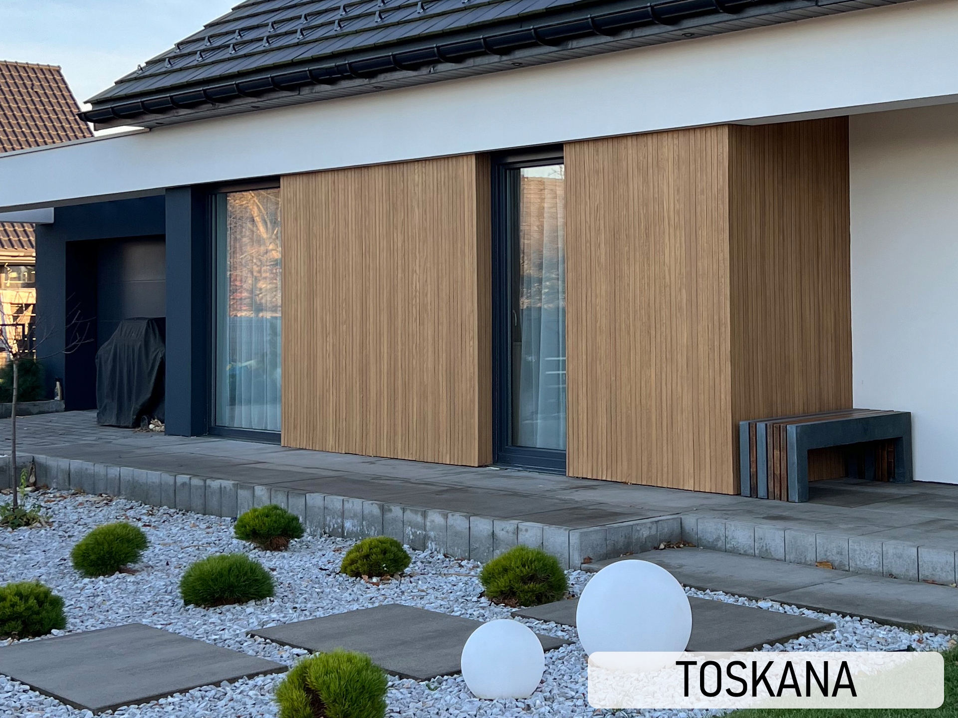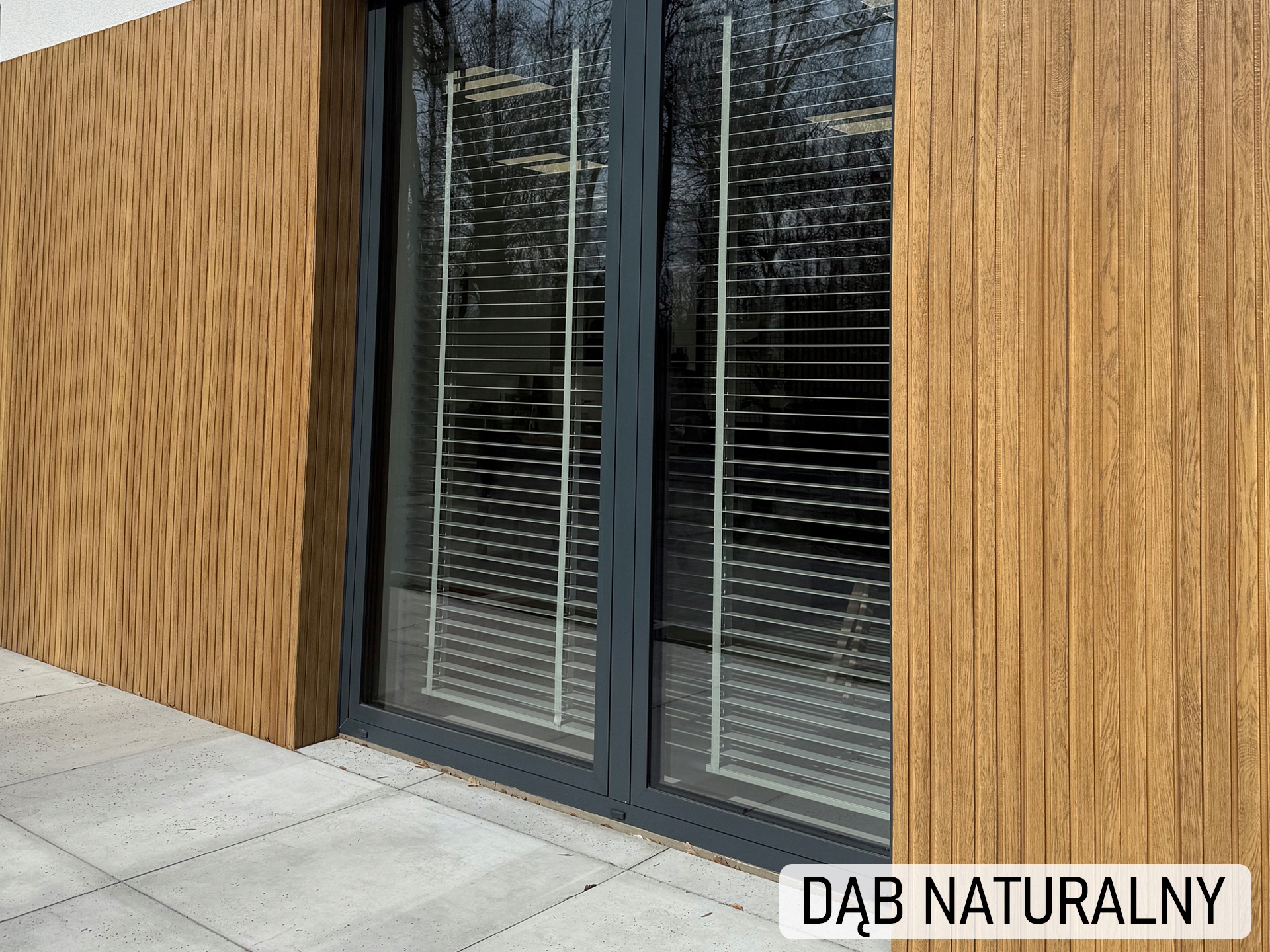 Pomalowane lamele perfekcyjnie odwzorowują naturalne drewno, w tym słoi i sęków, nadając elewacji elegancki i nowoczesny charakter.