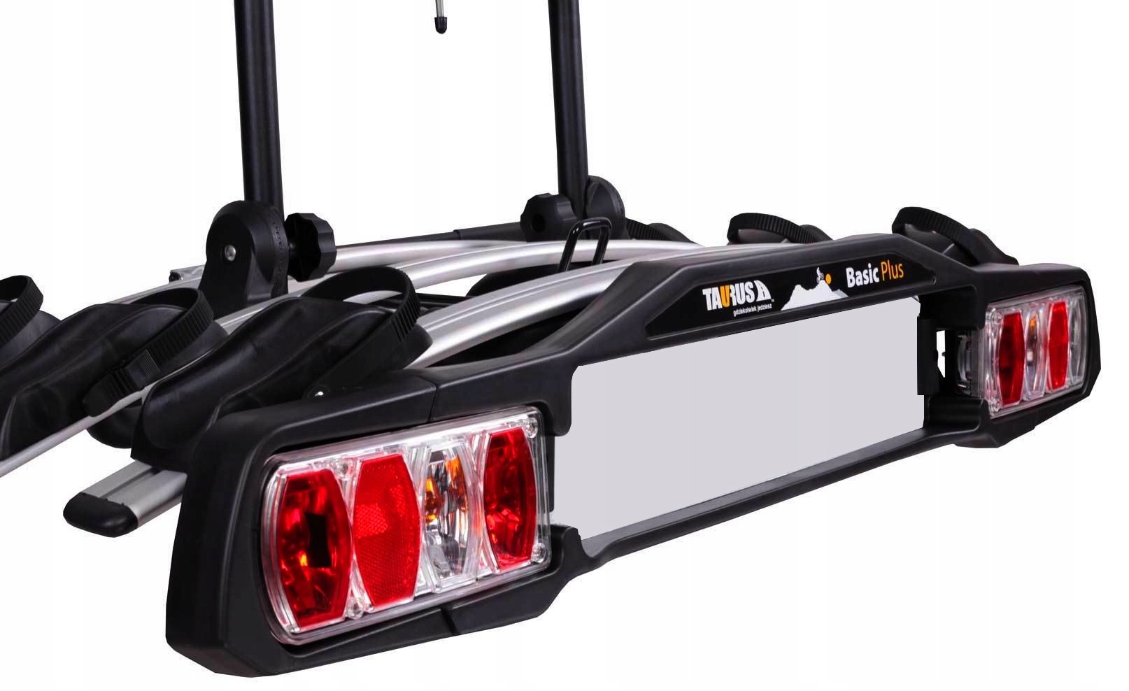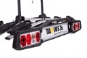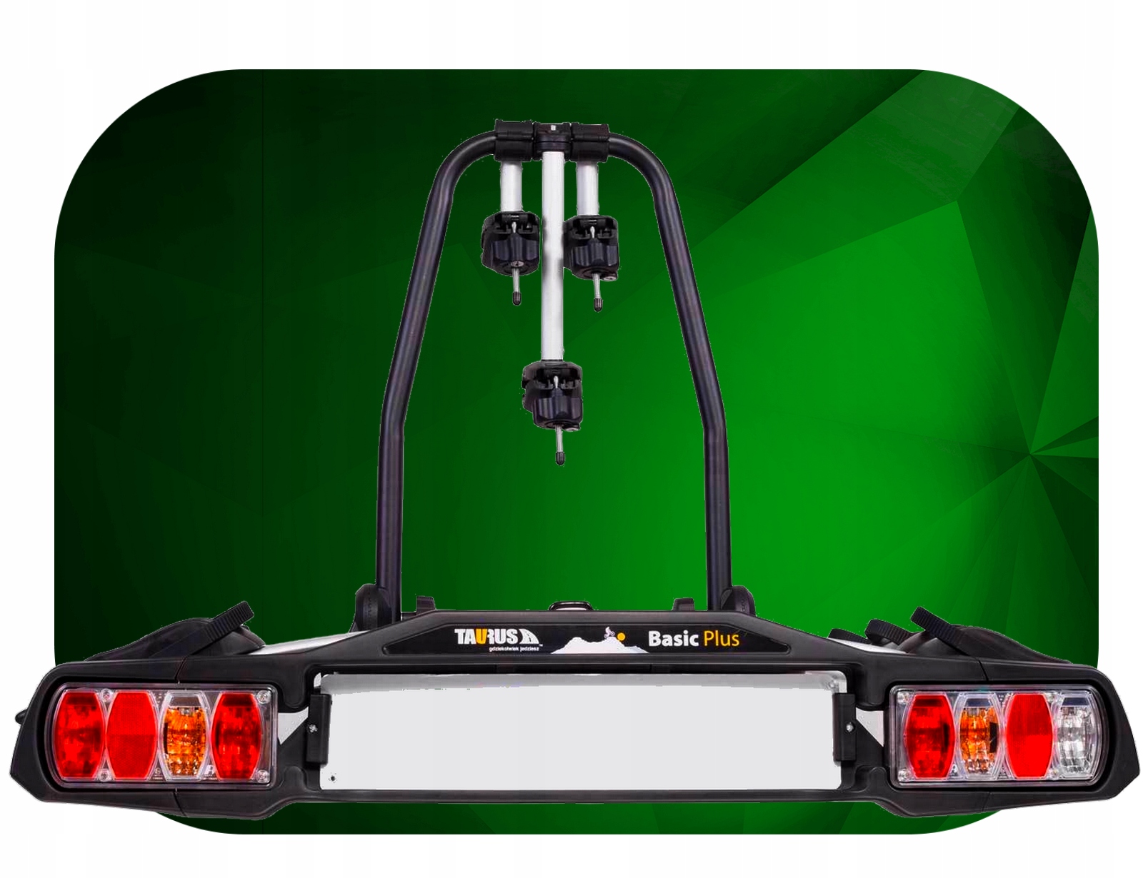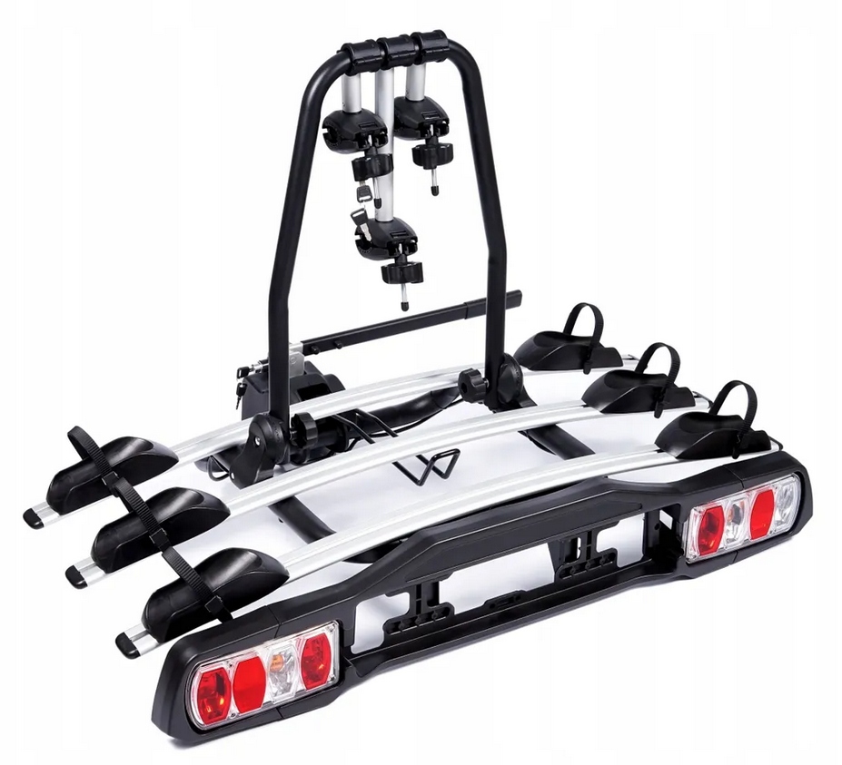 Platforma rowerowa do przewozu trzech rowerów na haku holowniczym w samochodzie.