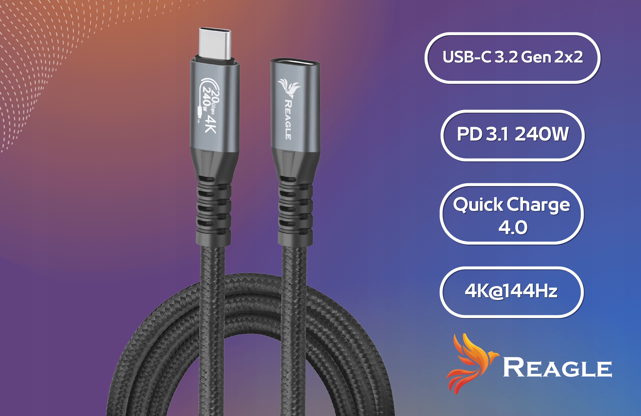 Model RPC300P od marki Reagle to nowoczesny przedłużacz USB-C Z mocą ładowania aż 240W, który nie tylko rozwiązuje problem zbyt krótkiego kabla, ale oferuje też ogromną wydajność, prędkość transferu do 20 Gb/s i obsługę wideo 4K@144Hz.