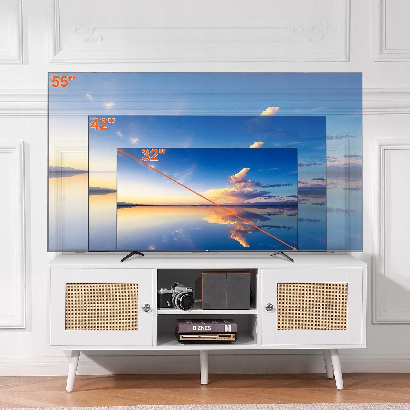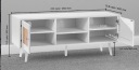 Elegancka szafka RTV zaprojektowana z myślą o nowoczesnych wnętrzach, łącząca w sobie naturalny urok rattanu z minimalistyczną bielą. Wytrzymała konstrukcja oraz przemyślane detale sprawiają, że jest idealnym wyborem do salonu lub pokoju multimedialnego. Przystosowana do telewizorów o przekątnej do 55 cali, z regulowanymi półkami, które zwiększają komfort użytkowania.