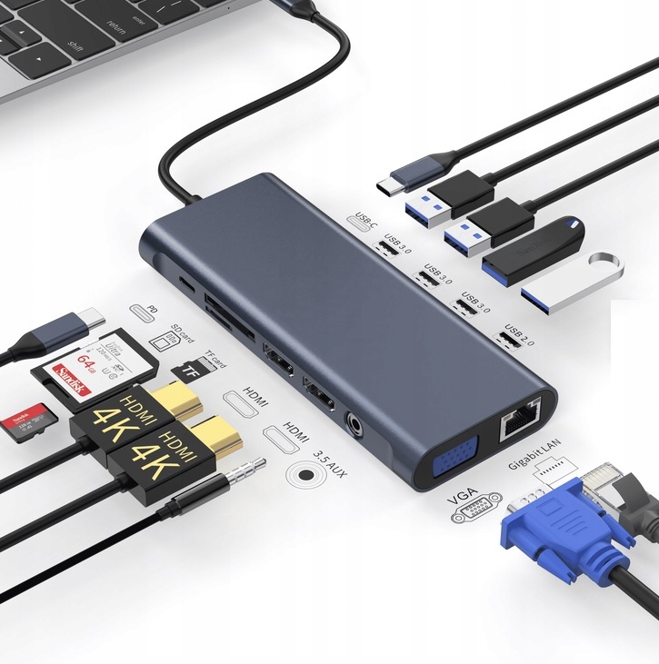 Szukasz wszechstronnej stacji dokującej, która rozwiąże problem braku portów w Twoim laptopie? Ten hub USB-C 13w1 to idealne rozwiązanie! Zamień jeden port USB-C w potężne centrum dowodzenia, które pozwoli Ci podłączyć wszystkie niezbędne urządzenia jednocześnie.